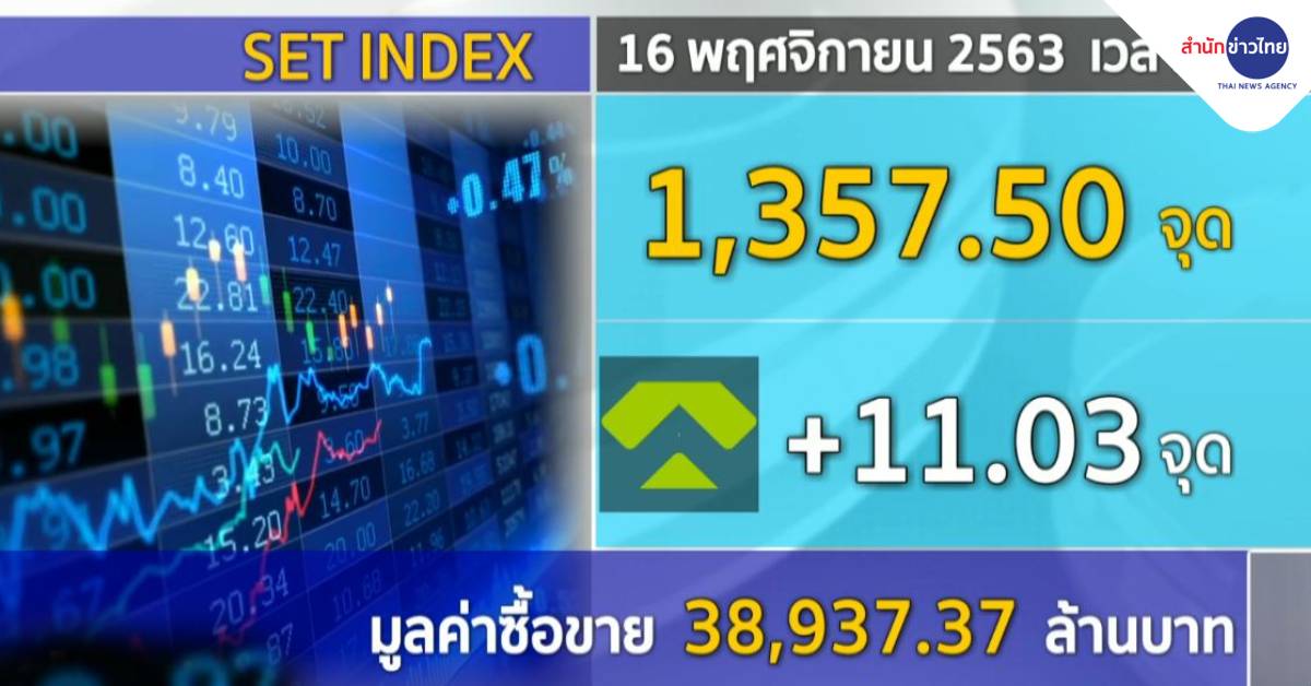 วันจันทร์ที่ 16 พฤศจิกายน วันแรกของสัปดาห์ เปิดมาหุ้นไทยสดใส ขานรับตัวเลขจีดีพีไตรมาส 3 ที่สภาพัฒน์ฯ ประกาศออกมา หดตัวน้อยกว่าคาด ดัชนีช่วงเที่ยงอยู่ที่ 1,357.50 จุด บวก 11.03 จุด มูลค่าการซื้อขาย 38,937.37 ล้านบาท