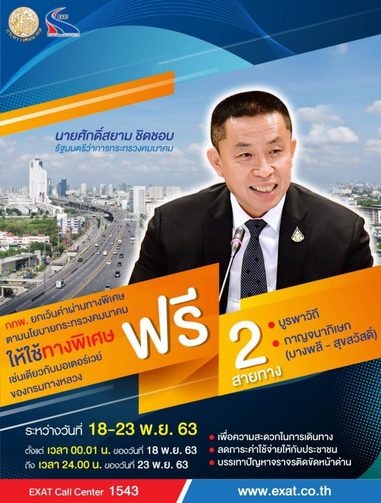 การทางพิเศษแห่งประเทศไทย (กทพ.) กระทรวงคมนาคม กำหนดยกเว้นค่าผ่านทางพิเศษของทางพิเศษบูรพาวิถี (บางนา-ชลบุรี) และทางพิเศษกาญจนาภิเษก (บางพลี-สุขสวัสดิ์) ตามที่รัฐบาลประกาศวันหยุดพิเศษ ทำให้มีวันหยุดต่อเนื่องติดต่อกัน 4 วัน โดยเริ่มยกเว้นค่าผ่านทางของทางพิเศษทั้ง 2 สายทาง ตั้งแต่เวลา 00.01 น. ของวันพุธที่ 18 พฤศจิกายน 2563 จนถึงเวลา 24.00 น. ของวันจันทร์ที่ 23 พฤศจิกายน 2563 รวม 6 วัน เช่นเดียวกับมอเตอร์เวย์ของกรมทางหลวง เพื่อเป็นการอำนวยความสะดวกในการเดินทางของประชาชนในวันหยุด และช่วยลดภาระค่าใช้จ่ายให้แก่ประชาชน รวมทั้งช่วยลดปัญหาจราจรติดขัดบริเวณหน้าด่านได้อีกด้วย