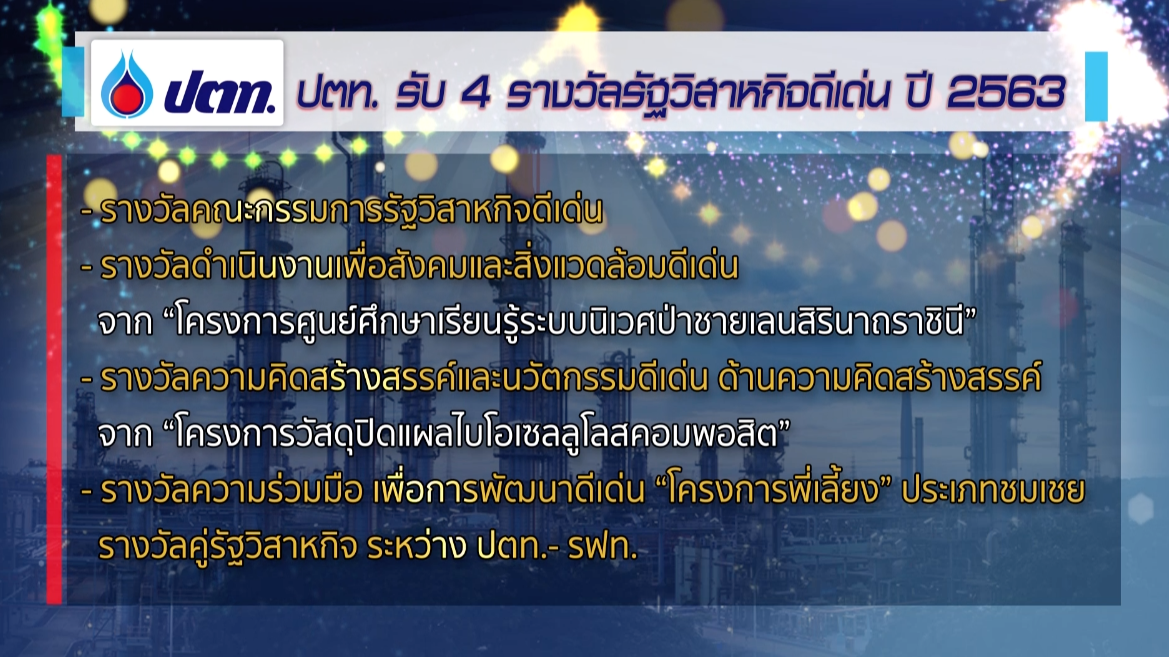 สำนักข่าวไทย 16 พ.ย.- ปตท.รับ 4 รางวัลรัฐวิสาหกิจดีเด่น ประจำปี 2563 ร่วมขับเคลื่อนประเทศสู่ความยั่งยืน
