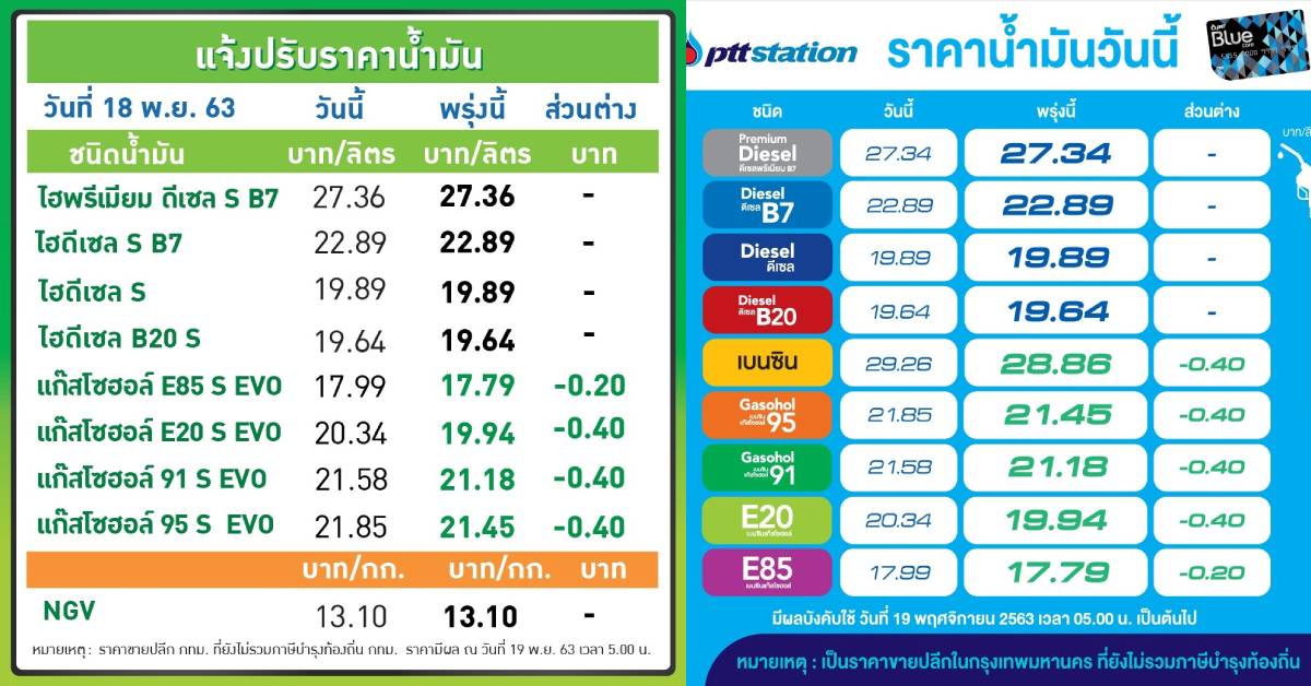 กทม. 18 พ.ย.-ปตท. ปรับลดราคาขายปลีกน้ำมันกลุ่มเบนซินและแก๊สโซฮอล์ทุกชนิดลง 40 สตางค์ต่อลิตร เว้น E85 ลดลง 20 สตางค์ต่อลิตร ส่วนกลุ่มดีเซล คงเดิม มีผลวันที่ 19 พ.ย.2563 เวลา 05.00 น. เป็นต้นไป