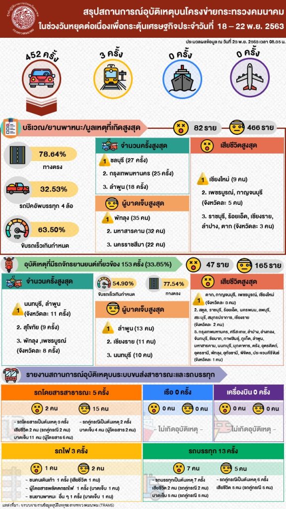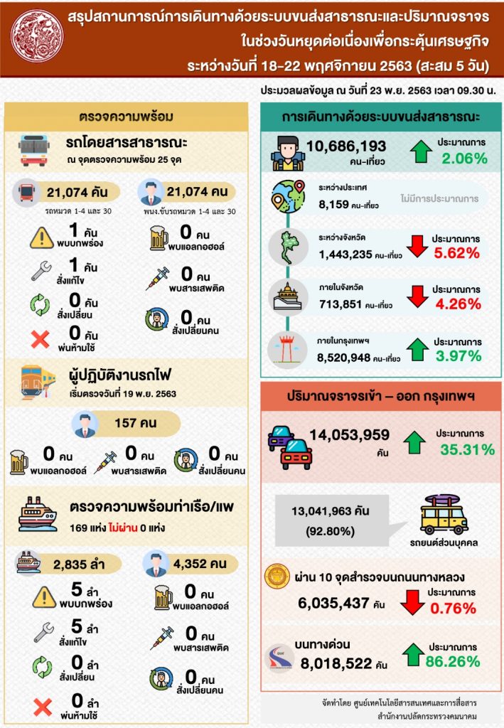 อย่างไรก็ตาม ในช่วงที่ผ่านมากระทรวงคมนาคมบูรณาการการทำงานร่วมกับหน่วยงานที่เกี่ยวข้องทุกภาคส่วน เพื่ออำนวยความสะดวก รวดเร็ว และดูแลความปลอดภัยการเดินทางของประชาชน ในช่วงวันหยุดต่อเนื่องระหว่างวันที่ 18 – 22 พฤศจิกายน 2563 โดยสรุปข้อมูลจากช่วงเวลาดังกล่าวทั้ง 5 วัน พบว่ามีประชาชนเดินทางด้วยระบบขนส่งสาธารณะ 10,686,193 คน – เที่ยว สูงกว่าประมาณการ 2.06% มีปริมาณการจราจรเข้า – ออกกรุงเทพฯ 14,053,959 คัน สูงกว่าประมาณการ 35.31% โดยพบว่าส่วนใหญ่เป็นรถยนต์ส่วนบุคคล 13,041,963 คัน ส่วนการเกิดอุบัติเหตุบนโครงข่ายของกระทรวงวันที่ 18 – 22 พฤศจิกายน 2563 พบว่าอุบัติเหตุเกิดขึ้น 455 ครั้ง โดยเป็นโครงข่ายทางถนน 452 ครั้ง และโครงข่ายทางราง 3 ครั้ง มีผู้เสียชีวิต 82 คน บาดเจ็บ 466 คน บริเวณที่เกิดอุบัติเหตุส่วนใหญ่เป็นทางตรง 78.64%