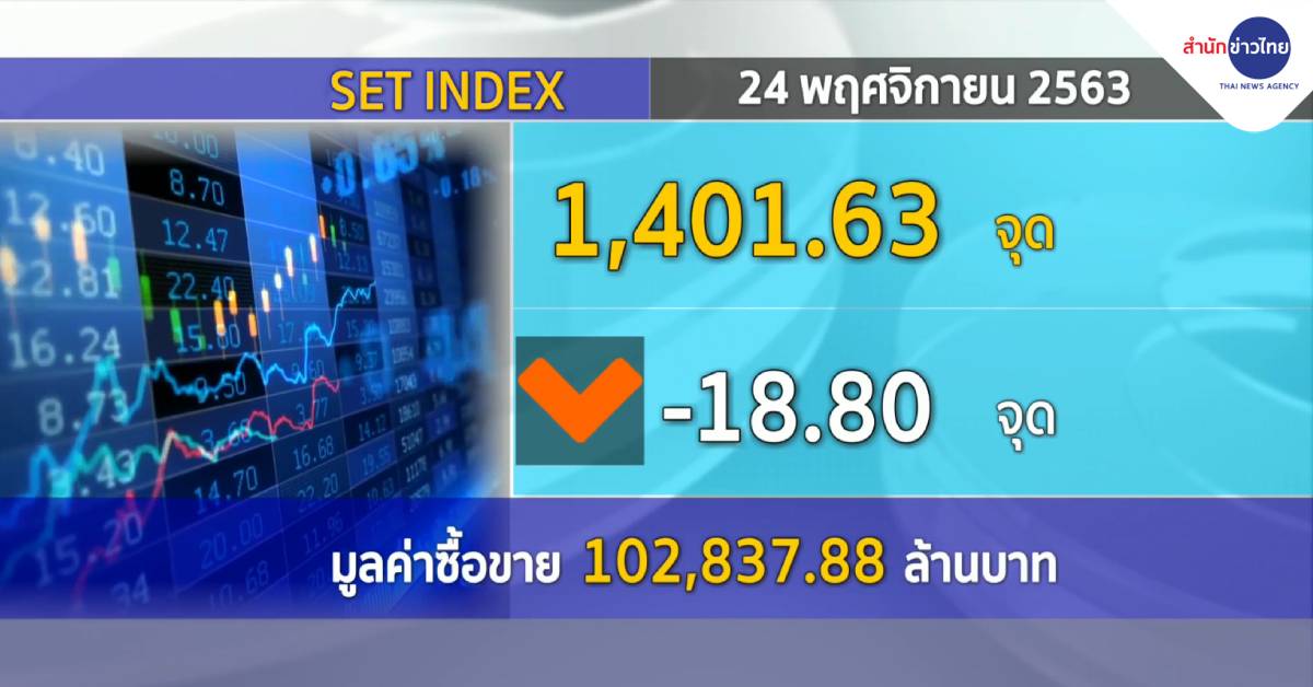 กรุงเทพฯ 24 พ.ย.– ตลาดหลักทรัพย์ปิดวันนี้ที่ระดับ 1,401.63 จุด ลดลง 18.80 จุด มูลค่าการซื้อขาย 102,837.88 ล้านบาท