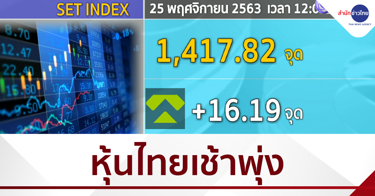 25 พ.ย.-ตลาดหุ้นไทยภาคเช้าพุ่ง ตามทิศทางตลาดต่างประเทศขานรับความคืบหน้าการผลิตวัคซีนต้านโควิด และคลายความกังวลจากการชุมนุมทางการเมืองที่ย้ายจุดชุมนุมไปหน้าสำนักงานใหญ่ ธนาคารไทยพาณิชย์แทน