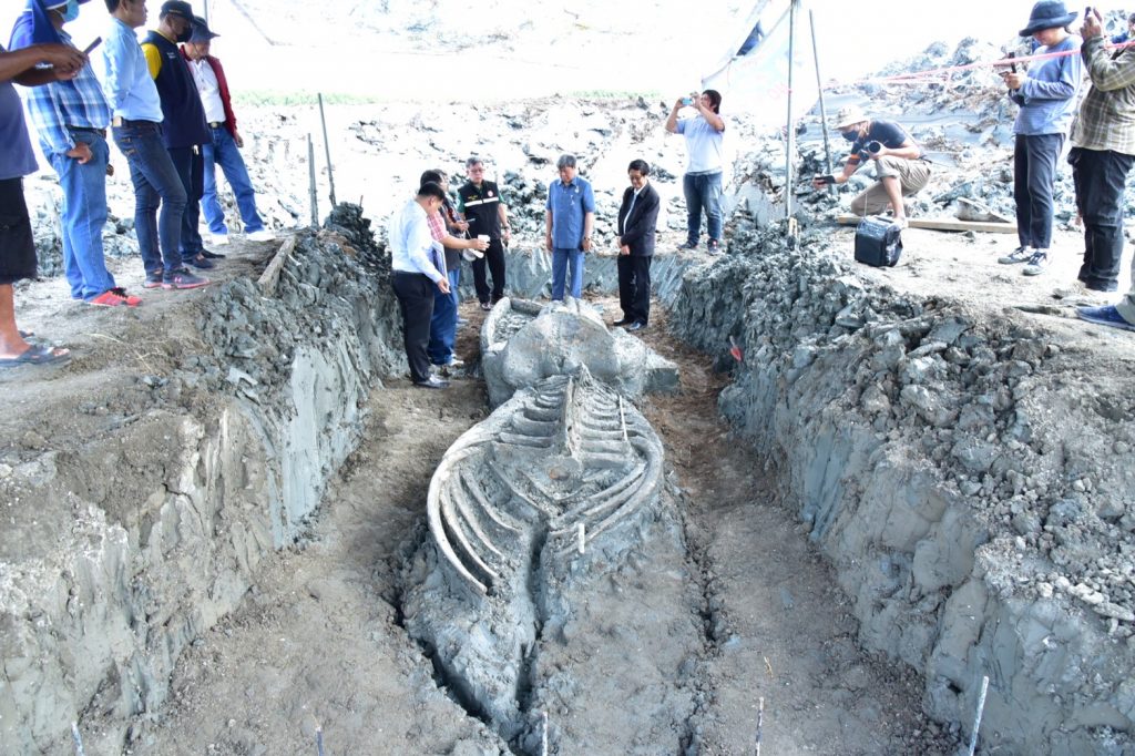 สำหรับการสำรวจขุดค้นซากวาฬดำเนินการโดยกรมทรัพยากรธรณี กรมทรัพยากรทางทะเลและชายฝั่ง รวมทั้งหน่วยงานที่เกี่ยวข้อง หลังได้รับแจ้งการค้นพบจากบริษัท ไบรท์ บลู วอเตอร์ คอร์เปอเรชั่น จำกัด เจ้าของพื้นที่ เมื่อวันที่ 6 พฤศจิกายนที่ผ่านมา พบว่าชิ้นส่วนกระดูกวาฬสะสมตัวอยู่ในตะกอนดินเหนียวทะเลโบราณ โครงกระดูกวาฬเปลี่ยนสภาพจากการแทนที่ของแร่ธาตุอื่นยังไม่สมบูรณ์ ส่วนใหญ่มีสภาพค่อนข้างเปราะบาง ดังนั้น จึงสำรวจขุดค้นตั้งแต่วันที่ 9 -15 พฤศจิกายน ประกอบด้วย กระดูกสันหลังที่สมบูรณ์ 19 ชิ้น กระดูกซี่โครงข้างละ 5 ชิ้น สะบักไหล่และแขน (ครีบ)
