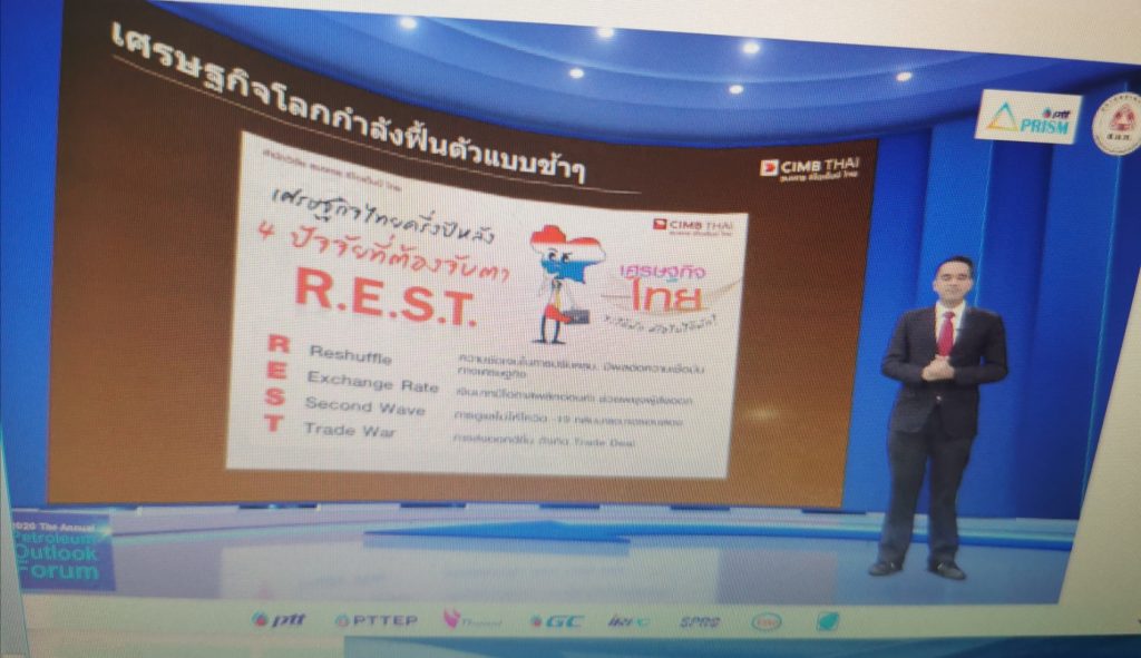 นายอมรเทพ จาวะลา ผู้ช่วยกรรมการผู้จัดการใหญ่ สำนักวิจัย ธนาคารซีไอเอ็มบีไทย กล่าวว่า คาดเศรษฐกิจไทยปีนี้จะหดตัวร้อยละ 6-7 ปีหน้าจะขยายตัวร้อยละ 3.5 -4.5 และมองว่าเศรษฐกิจไทยจะฟื้นกลับมาปกติใน 2 ปีข้างหน้า โดยปัจจัยที่ต้องจับขึ้นกับ 4 เรื่องหลัก คือ REST ประกอบด้วย 1.Reshuffle ความชัดเจนในการปรับ ครม. มีผลต่อความเชื่อมั่นทางเศรษฐกิจ อย่างไรก็ตาม มีการมองประเทศไทยเหมือนกับกระทะเคลือบเทฟร่อน ซึ่งแม้จะมีปัญหาการเมืองบ่อยครั้ง แต่เศรษฐกิจก็ไม่ติดขัดกับการเมือง การฟื้นตัวยังคงต้องพึ่งเศรษฐกิจในประเทศ ก็จะเห็นว่าไทยเริ่มฟื้นตัวจากจากการท่องเที่ยวในต่างจังหวัด ส่วนการบริโภคและการลงทุนก็ต้องใช้เวลา