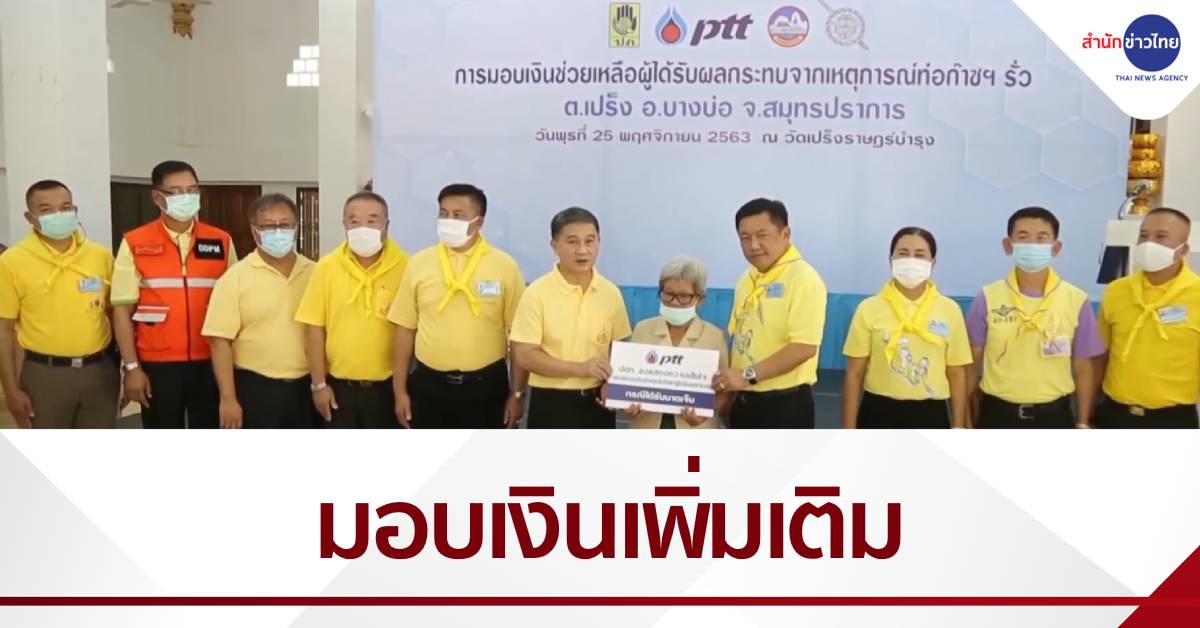 สมุทรปราการ 26 พ.ย. – ปตท. มอบเงินช่วยเหลือให้ผู้บาดเจ็บและผู้ได้รับผลกระทบจากเหตุการณ์ท่อก๊าซฯ รั่ว จ.สมุทรปราการ เพิ่มเติม