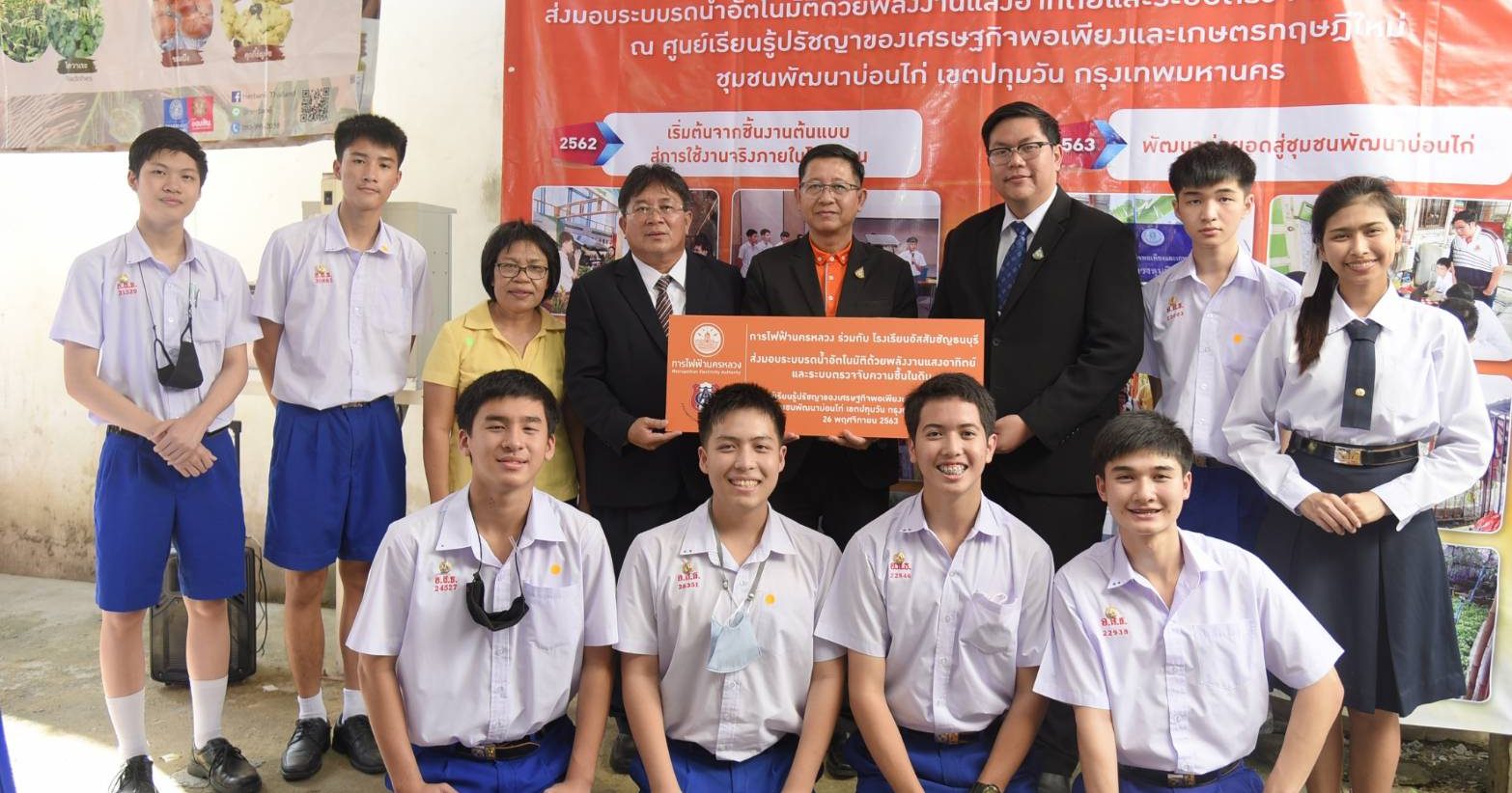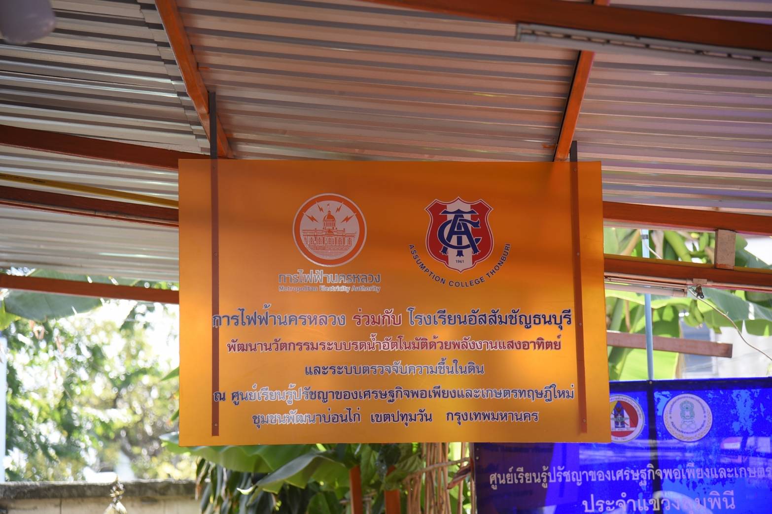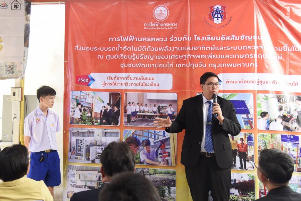 ผู้ช่วยผู้ว่าการ MEA กล่าวว่า MEA มีภารกิจในการจ่ายกระแสไฟฟ้า และให้บริการด้านระบบไฟฟ้าแก่ประชาชนในพื้นที่กรุงเทพมหานคร นนทบุรี และสมุทรปราการ โดคำนึงถึงคุณภาพความเชื่อถือได้ของระบบ และความปลอดภัยของผู้ใช้ไฟฟ้า รวมทั้งให้ความสำคัญด้านความรับผิดชอบต่อสังคมและสิ่งแวดล้อม โดยมีประเด็นที่สำคัญคือ การใช้ทักษะ และความรู้ความชำนาญขององค์กร ในการช่วยเหลือ สนับสนุน และพัฒนาชุมชนในเขตพื้นที่จำหน่าย เพื่อให้ประชาชนมีคุณภาพชีวิตที่ดีมากยิ่งขึ้น โดยวัตถุประสงค์ของกิจกรรมในวันนี้ เพื่อส่งมอบ “ระบบรดน้ำอัตโนมัติด้วยพลังงานแสงอาทิตย์และเซ็นเซอร์ตรวจจับความชื้นในดิน” ให้แก่ศูนย์เรียนรู้ปรัชญาของเศรษฐกิจพอเพียงและเกษตรทฤษฎีใหม่ ชุมชนพัฒนาบ่อนไก่ ซึ่งเป็นผลงานนวัตกรรมจากโรงเรียนอัสสัมชัญธนบุรี ENnovation School ที่ MEA สนับสนุนงบประมาณและควบคุมการดำเนินงาน เมื่อปี 2562 มาประยุกต์ใช้ในศูนย์เรียนรู้ปรัชญาของเศรษฐกิจพอเพียงและเกษตรทฤษฎีใหม่ ชุมชนพัฒนาบ่อนไก่