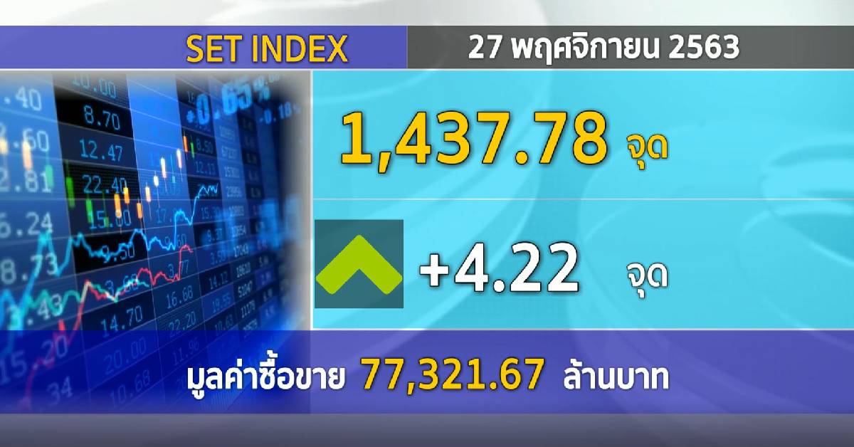 กทม. 27 พ.ย.-ตลาดหลักทรัพย์ปิดวันนี้ที่ระดับ 1,437.78 จุด เพิ่มขึ้น 4.22 จุด (+0.29%) มูลค่าการซื้อขาย 77,321.67 ล้านบาท