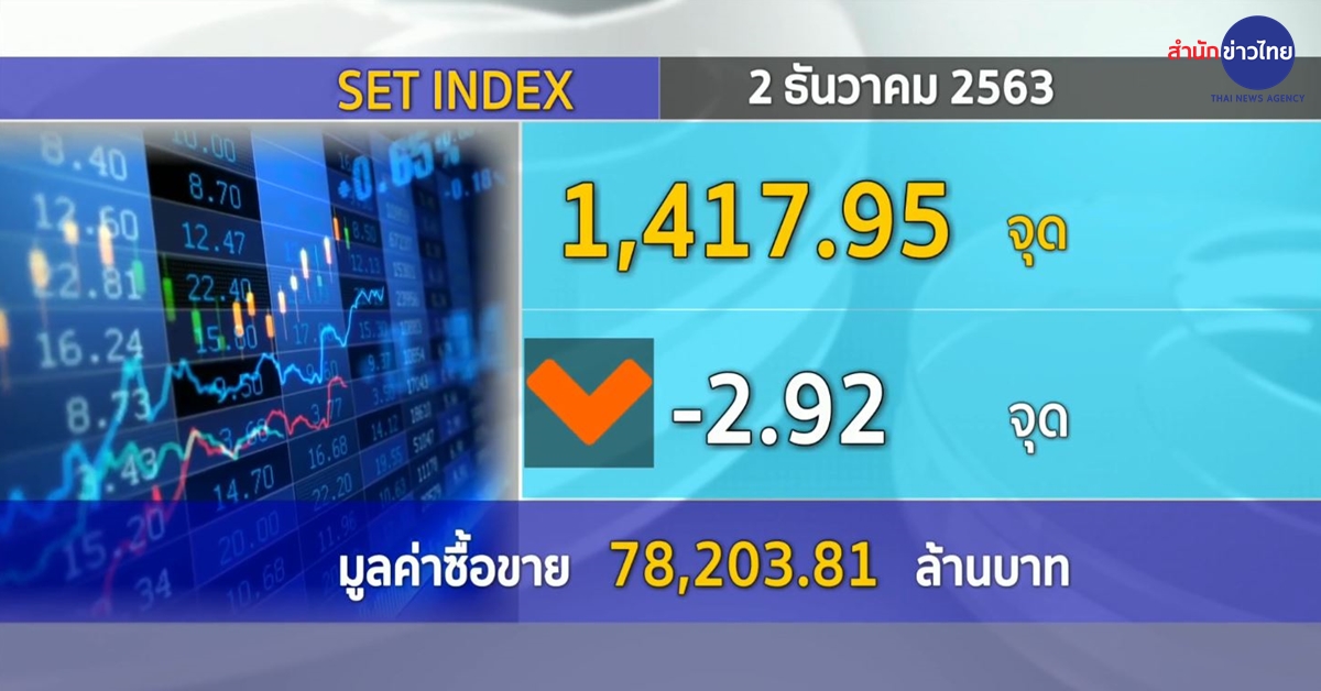 กรุงเทพฯ 2 ธ.ค. – ดัชนีตลาดหุ้นไทยวันนี้ (2 ธ.ค.) ปิดที่ 1,417.95 จุด ลดลง 2.92 จุด ด้วยมูลค่าการซื้อขาย 78,203.81 ล้านบาท. – สำนักข่าวไทย