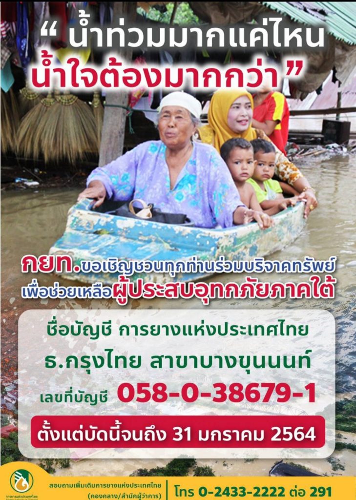 นอกจากนี้ กยท.ขอเชิญชวนร่วมช่วยเหลือเกษตรกรชาวสวนยางที่ประสบอุทกภัยภาคใต้ โดยบริจาคทรัพย์ผ่านบัญชี การยางแห่งประเทศไทย เลขที่บัญชี 058-0-38679-1 ธนาคารกรุงไทย สาขาบางขุนนนท์ ได้ตั้งแต่บัดนี้ ถึง 31 มกราคม 2564 สอบถามเพิ่มเติมได้ที่ การยางแห่งประเทศไทย (กองกลาง) โทร 0-2433-2222 ต่อ 291.-สำนักข่าวไทย