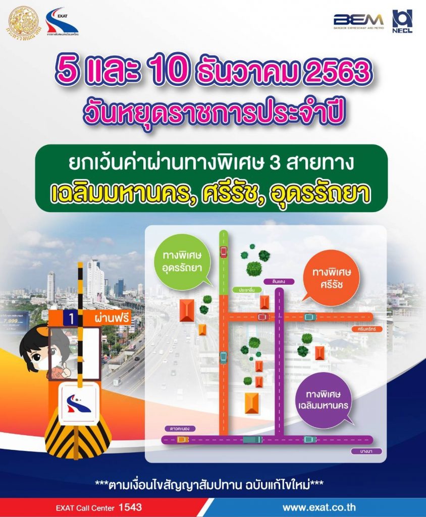 การทางพิเศษแห่งประเทศไทย (กทพ.) กระทรวงคมนาคม ยกเว้นค่าผ่านทางพิเศษเฉลิมมหานคร ทางพิเศษศรีรัช และทางพิเศษอุดรรัถยา 3 สายทาง ในวันเสาร์ที่ 5 ธันวาคม 2563 (วันคล้ายวันพระราชสมภพของพระบาทสมเด็จพระบรมชนกาธิเบศร มหาภูมิพลอดุลยเดชมหาราชบรมนาถบพิตร วันชาติ และวันพ่อแห่งชาติ) และวันพฤหัสบดีที่ 10 ธันวาคม 2563 (วันรัฐธรรมนูญ) ตั้งแต่เวลา 00.01 น. ถึง 24.00 น.