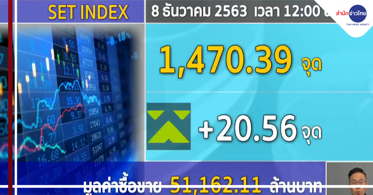 8 ธ.ค. – ตลาดหุ้นไทยวันนี้ยังได้แรงบวกจากเงินทุนต่างชาติที่ไหลเข้าต่อเนื่องจากความคืบหน้าวัคซีนต้านโควิดและรอลุ้นข่าวดีมาตรการกระตุ้นเศรษฐกิจจาก ครม. ดัชนีช่วงเที่ยงอยู่ที่ 1,470.39 จุด เพิ่มขึ้น 20.56 จุด มูลค่าซื้อขาย 51,162.11 ล้านบาท