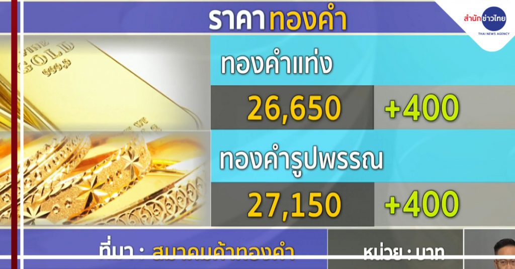 ส่วนราคาทองในประเทศ พุ่งแรงถึง 400 บาท ตามราคาตลาดโลก ทองคำแท่งขายออก 26,650 บาท ทองรูปพรรณ ขายออก 27,150 บาท .- สำนักข่าวไทย