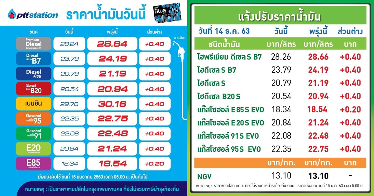 กรุงเทพฯ 14 ธ.ค. – ปตท.-บางจากฯ ปรับราคาขายปลีกน้ำมันทุกชนิดเพิ่มขึ้น 40 สต./ลิตร ยกเว้น E85 ปรับขึ้น 20 สต. มีผล 15 ธ.ค.