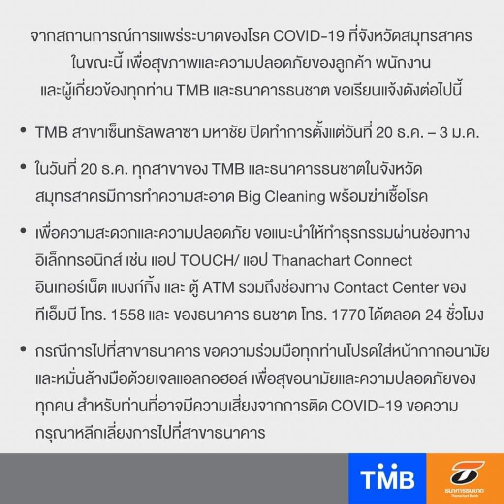 ธนาคารทหารไทย (TMB) และธนาคารธนชาต โดยธนาคารทหารไทยแจ้งปิดสาขาเซ็นทรัลพลาซา มหาชัย ตั้งแต่วันที่ 20 ธ.ค. 63-3 ม.ค.64 โดยในวันที่ 20 ธ.ค.63 ทุกสาขาของ TMB และ ธนาคารธนชาตในจังหวัดสมุทรสาครมีการทำความสะอาด Big Cleaning พร้อมฆ่าเชื้อโรค .- สำนักข่าวไทย
