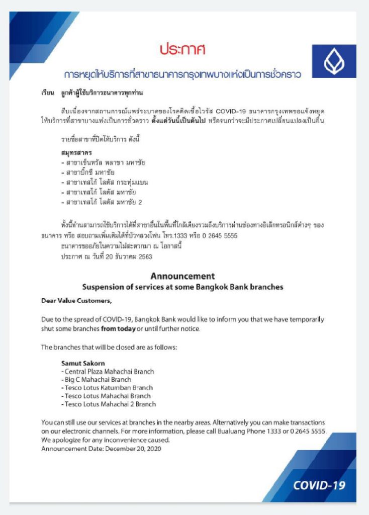 20 ธ.ค. – ธนาคารกรุงเทพ แจ้งว่า ธนาคารกรุงเทพในพื้นที่สมุทรสาคร มีจำนวน 5 สาขา ที่ต้องปิดทำการตามประกาศผู้ว่าราชการจังหวัดสมุทรสาคร ประกอบด้วย 1. สาขาเซ็นทรัลมหาขัย , 2. สาขาโลตัสมหาชัย, 3. สาขาโลตัสมหาขัย 2, 4. สาขาบิ๊กซี มหาชัย และ 5. สาขาเทสโก้ โลตัส พระทุ่มแบน