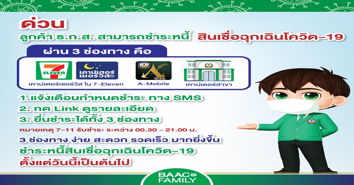 นอกจากนี้ ธนาคารได้พัฒนาช่องทางการชำระเงิน เพื่ออำนวยความสะดวกให้กับลูกค้าที่ใช้บริการสินเชื่อฉุกเฉินผ่านเคาน์เตอร์เซอร์วิสใน 7-Eleven โดยลูกค้าสามารถแสดงเอกสารใบแจ้งเตือนที่ส่งมาพร้อม SMS ต่อพนักงานผู้ให้บริการ ค่าธรรมเนียม 10 บาท และช่องทางผ่านแอปพลิเคชัน ธ.ก.ส.A-Mobile โดยสแกน QR Code ที่อยู่ในใบแจ้งเตือน ระหว่างเวลา 00.30 ถึง 21.00 น. ทุกวันไม่เว้นวันหยุดราชการ ซึ่งสามารถใช้บริการได้ตั้งแต่บัดนี้เป็นต้นไป หรือสอบถามรายละเอียดเพิ่มเติมได้ที่ Call Center 02 555 0555.-สำนักข่าวไทย