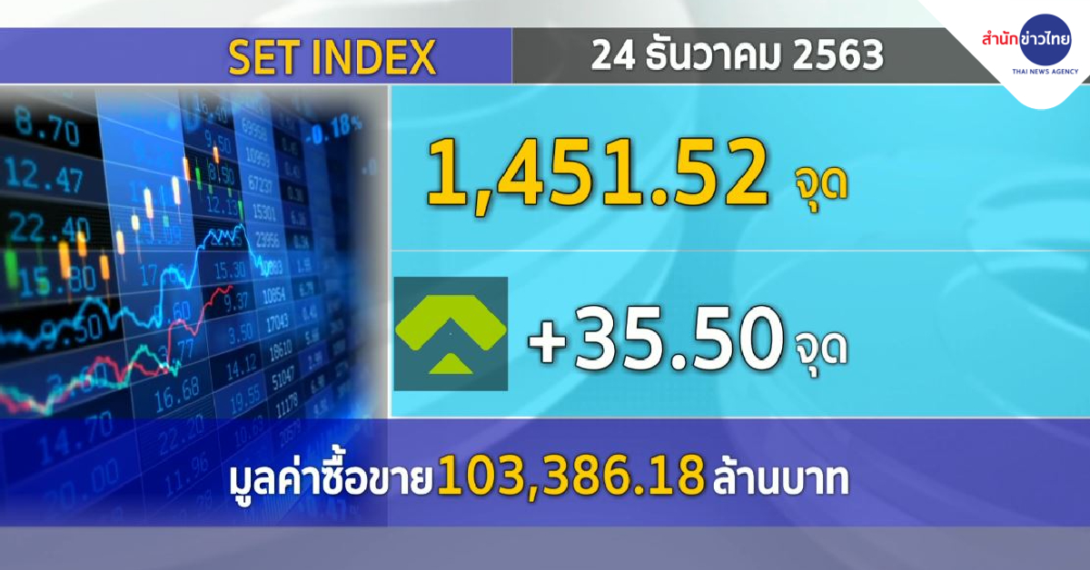 กรุงเทพฯ 22 ธ.ค. – ดัชนีตลาดหุ้นไทยวันนี้ (24 ธ.ค.) ปิดที่ 1,451.52 จุด เพิ่มขึ้น 35.50 จุด มูลค่าการซื้อขาย 103,386.18 ล้านบาท. -สำนักข่าวไทย