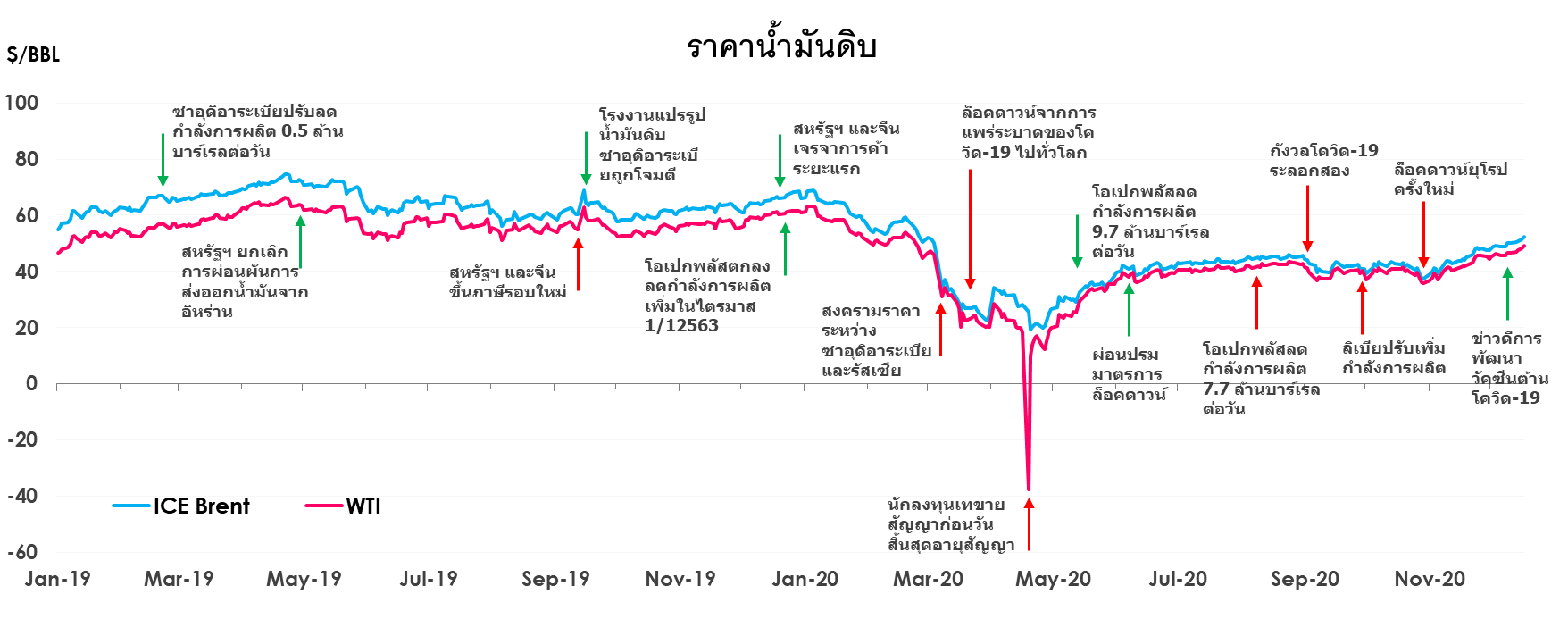 อย่างไรก็ตาม ราคาน้ำมันดิบในปี 2564 ยังถูกกดดันจากอุปทานน้ำมันดิบที่มีแนวโน้มปรับตัวเพิ่มขึ้น เนื่องจากกลุ่มโอเปกและประเทศพันธมิตรมีแผนปรับลดกำลังการผลิตน้อยลงเพื่อสอดคล้องกับความต้องการใช้น้ำมันที่คาดว่าจะเพิ่มขึ้น โดยผลการประชุมของกลุ่มโอเปกและประเทศพันธมิตรเมื่อวันที่ 3 – 4 ธันวาคม 2563 มีข้อตกลงปรับระดับการลดการผลิตจาก 7.7 ล้านบาร์เรลต่อวัน ในช่วงเดือนสิงหาคมถึงธันวาคม 2563 ไปอยู่ที่ 7.2 ล้านบาร์เรลต่อวัน ในเดือนมกราคม 2564 และมีแผนการประชุมรายเดือนต่อไปเพื่อพิจารณาลดระดับการปรับลดกำลังการผลิตตามความต้องการใช้น้ำมันที่ฟื้นตัว ขณะที่ อุปทานน้ำมันจากประเทศนอกกลุ่มโอเปก เช่น ประเทศนอร์เวย์และบราซิล มีแนวโน้มปรับเพิ่มขึ้นราว 0.53 ล้านบาร์เรลต่อวัน เช่นกัน