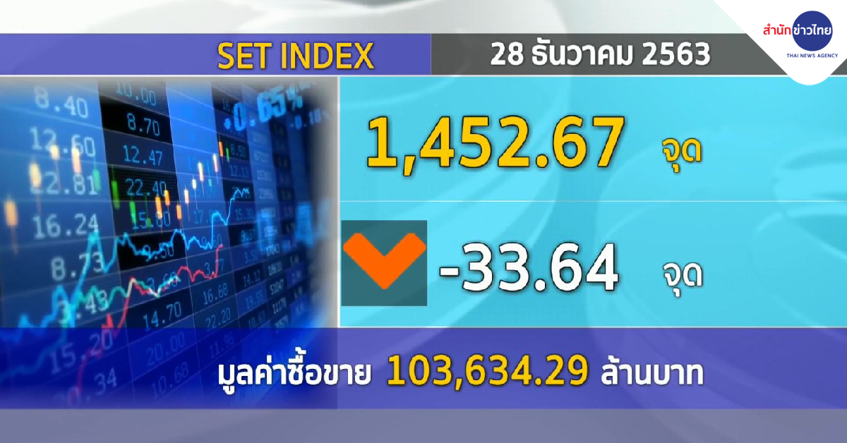 กรุงเทพฯ 28 ธ.ค. – ดัชนีตลาดหุ้นไทยวันนี้ (28 ธ.ค.) ปิดที่ระดับ 1,452.67 จุด ลดลง 33.64 จุด ด้วยมูลค่าการซื้อขาย 103,634.29 ล้านบาท. – สำนักข่าวไทย