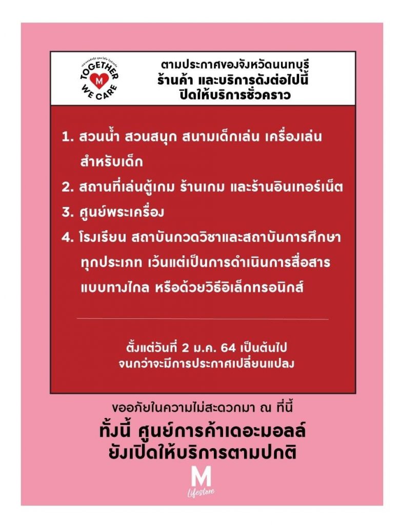 เพื่อเป็นไปตามประกาศของจังหวัดนนทบุรี ตามมาตรการป้องกัน โรคโควิด-19 ร้านค้า และบริการในศูนย์การค้าสาขาเดอะมอลล์ไลฟ์สโตร์งามวงศ์วาน ดังต่อไปนี้ ปิดให้บริการชั่วคราว ตั้งแต่วันที่ 2 ม.ค. 64 เป็นต้นไป จนกว่าจะมีการประกาศเปลี่ยนแปลง