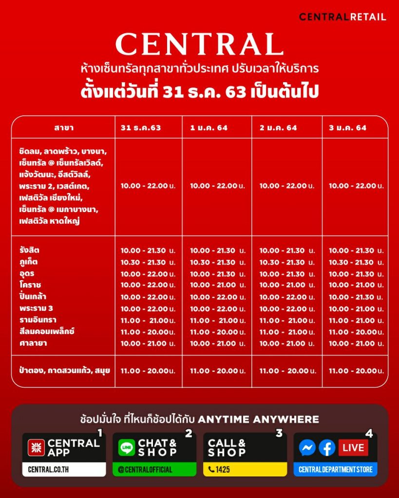 เซ็นทรัลขอแจ้งเวลา เปิด-ปิด ให้บริการของแต่ละสาขาดังต่อไปนี้ โดยมีผลตั้งแต่วันที่ 31 ธ.ค. 63 เป็นต้นไป