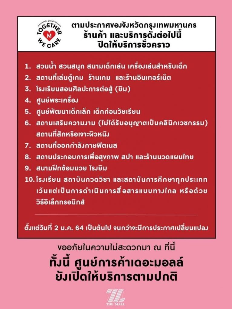 เพื่อเป็นไปตามประกาศของจังหวัดกรุงเทพฯ ตามมาตรการป้องกัน โรคโควิด-19 ร้านค้า และบริการในศูนย์การค้าเดอะมอลล์สาขา ท่าพระ บางแค และ บางกะปิ ดังต่อไปนี้ ปิดให้บริการชั่วคราว ตั้งแต่วันที่ 2 ม.ค. 64 เป็นต้นไป จนกว่าจะมีการประกาศเปลี่ยนแปลง