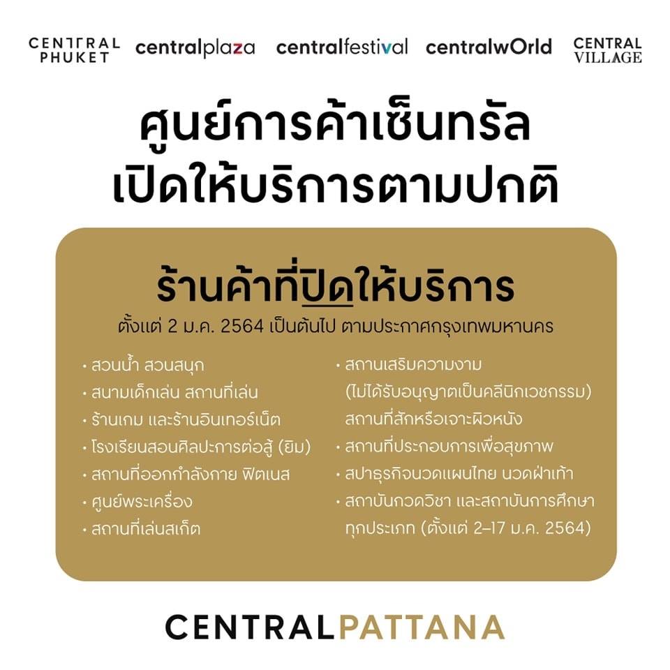 ศูนย์การค้าเซ็นทรัล ยังคงเปิดให้บริการตามปกติ ภายใต้การคุมเข้มมาตรการเชิงรุกแผนแม่บท “เซ็นทรัล สะอาด มั่นใจ” โดยขอแจ้งการปิดให้บริการบางธุรกิจชั่วคราว ตามประกาศกรุงเทพมหานคร เริ่มตั้งแต่วันที่ 2 ม.ค. 2564 เป็นต้นไป (หรือจนกว่าจะมีการเปลี่ยนแปลง)
