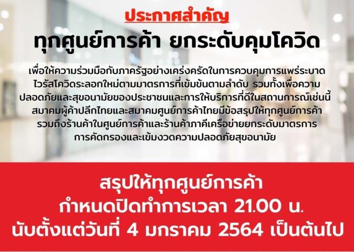 กทม. 2 ม.ค.-สมาคมผู้ค้าปลีกไทย ประกาศทุกศูนย์การค้า ยกระดับคุมโควิด ให้ทุกศูนย์การค้ากำหนดปิดทำการเวลา 21.00 น. นับตั้งแต่วันที่ 4 ม.ค.64 เป็นต้นไป