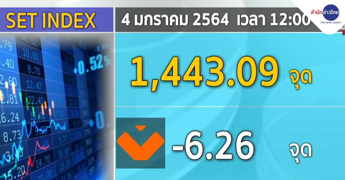 4 ม.ค.-ตลาดหุ้นไทยวันแรกของปี เปิดเทรดมาลดลงไปกว่า 20 จุด แต่รีบาวน์ขึ้นมา ล่าสุด เคลื่อนไหวที่ ติดลบ 6.26 จุด มูลค่าการซื้อขาย 1,443.09 จุด มูลค่าการซื้อขาย 39,1556.57 ล้านบาท