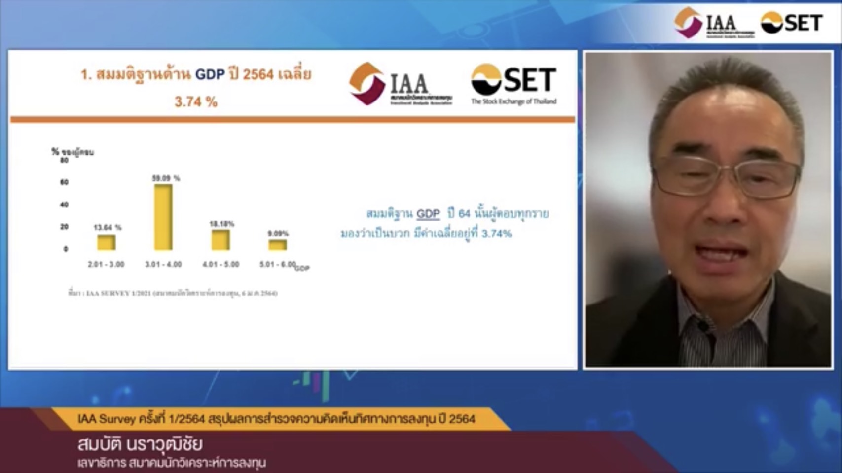 นายสมบัติ นราวุฒิชัย เลขาธิการสมาคมนักวิเคราะห์การลงทุน เปิดเผยผลสำรวจความเห็นของนักวิเคราะห์และผู้จัดการกองทุนต่อมุมมองในด้านการลงทุนและคาดการณ์ทิศทางดัชนีราคาหุ้นไทย (SET Index) ในปี 2564 โดยคาดว่า เป้าหมายดัชนี ณ วันสิ้นปี 2564 จะอยู่ที่ประมาณ 1,559 จุด ซึ่งสูงกว่าระดับดัชนี ณ วันสิ้นปี 2563 ซึ่งอยู่ที่ 1,449 และมีจุดต่ำสุดของดัชนีราคาหุ้นไทยระหว่างปี มีค่าเฉลี่ยจุดต่ำสุด ที่ 1,338 จุด