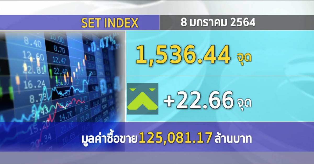 กทม. 8 ม.ค.-ตลาดหลักทรัพย์ปิดวันนี้ที่ระดับ 1,536.44 จุด เพิ่มขึ้น 22.66 จุด (+1.50%) มูลค่าการซื้อขาย 125,081.17 ล้านบาท ปรับตัวขึ้นในทิศทางเดียวกับตลาดต่างประเทศ