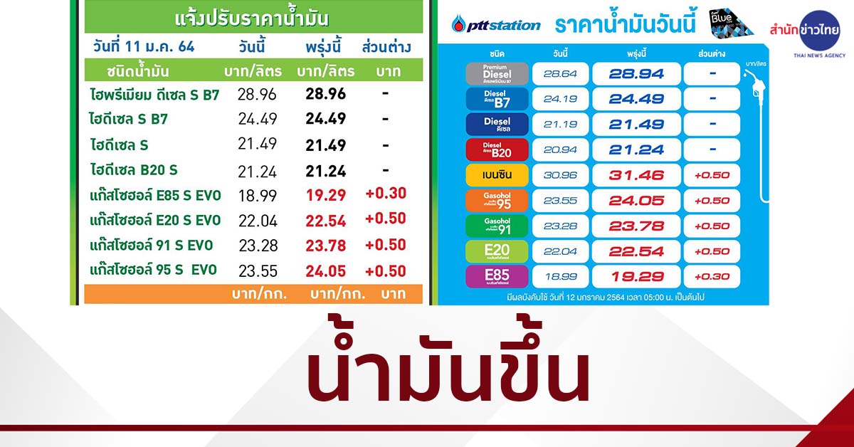 11 ม.ค.-PTT Station – บางจากฯ ปรับขึ้นราคาขายปลีกน้ำมันกลุ่มเบนซินและแก๊สโซฮอล์ทุกชนิด 50 สตางค์/ลิตร เว้น E85 ขยับขึ้น 30 สตางค์/ลิตร ส่วนกลุ่มดีเซลทุกชนิด คงเดิม มีผลวันที่ 12 มกราคม 2564 เวลา 05.00 น. เป็นต้นไป