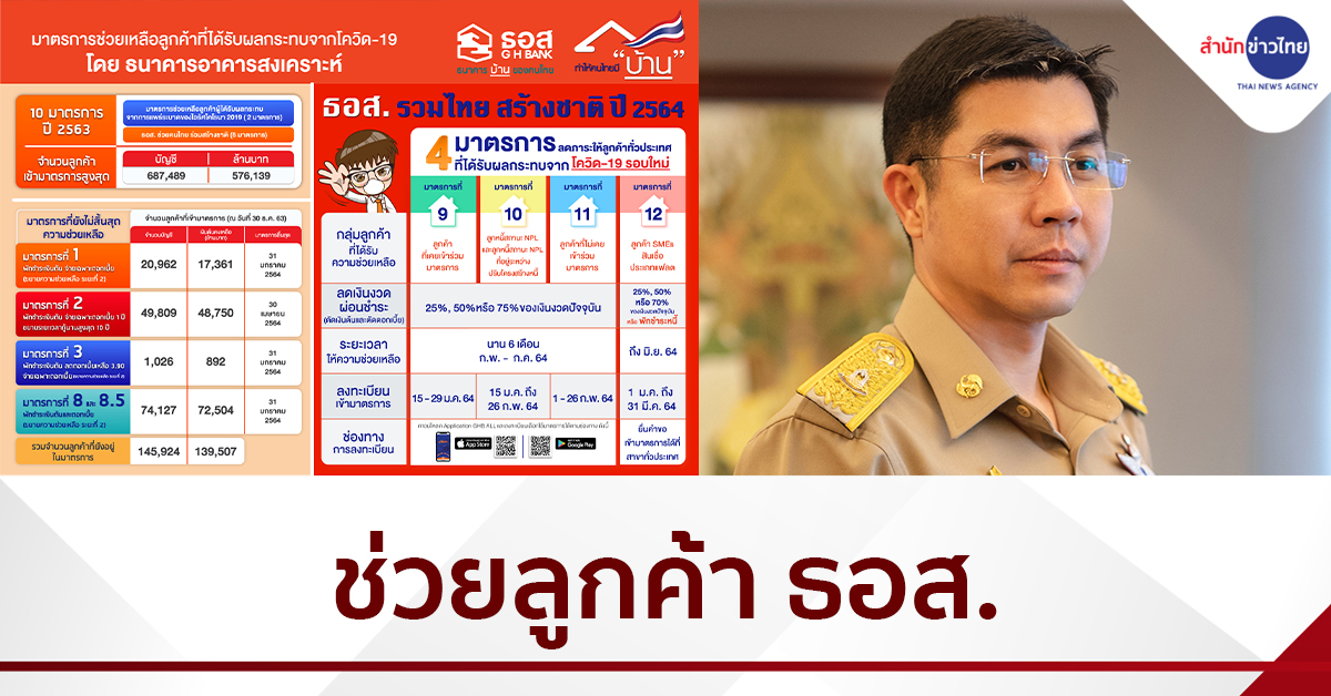 นายฉัตรชัย ศิริไล กรรมการผู้จัดการ ธนาคารอาคารสงเคราะห์ (ธอส.) เปิดเผยว่า วันนี้ (12 มกราคม 2564) ที่ประชุมคณะรัฐมนตรี(ครม.) มีมติรับทราบมาตรการช่วยเหลือลูกค้าที่ได้รับผลกระทบ จากการแพร่ระบาดของโรคติดเชื้อไวรัสโคโรนา 2019 (โควิด-19) ที่ระบาดรอบใหม่ ของสถาบันการเงินสมาชิกสมาคมสถาบันการเงินของรัฐ(SFIs) ตามนโยบายของกระทรวงการคลัง โดยในส่วนของ ธอส. คณะกรรมการธนาคารมีมติเห็นชอบในหลักการให้จัดทำมาตรการช่วยเหลือลูกค้าที่ได้รับผลกระทบด้านรายได้จากโควิด-19 ผ่าน “โครงการ ธอส. รวมไทย สร้างชาติ ปี 2564” ด้วย 4 มาตรการลดเงินงวดผ่อนชำระ(ตัดเงินต้นและตัดดอกเบี้ย) นานสูงสุด 6 เดือน ครอบคลุมทั้งลูกค้าที่เคยหรืออยู่ระหว่างใช้ “มาตรการช่วยเหลือลูกค้าผู้ได้รับผลกระทบจากการแพร่ระบาดของไวรัสโคโรนา 2019 (COVID-19)” และ “โครงการ ธอส. ช่วยคนไทย ร่วมสร้างชาติ” รวมถึงลูกค้าที่ไม่เคยเข้าร่วมมาตรการฯ ทั้งลูกค้ารายย่อยและกลุ่ม SMEs ที่มีสถานะปกติ หรือสถานะ NPL ประกอบด้วย