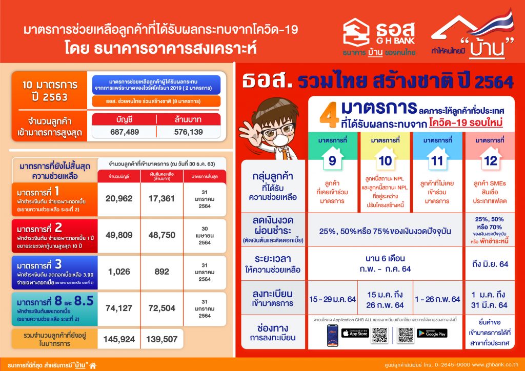 มาตรการที่ 9 สำหรับลูกค้าที่เคยเข้าร่วมหรืออยู่ระหว่างใช้มาตรการช่วยเหลือฯ ของ ธอส.ลูกค้าที่มีสิทธิ์แจ้งความประสงค์ขอใช้มาตรการจะต้องมีคุณสมบัติ คือ มีสถานะบัญชีปกติ ไม่อยู่ระหว่างการประนอมหนี้ ลดเงินงวดผ่อนชำระ(ตัดเงินต้นและตัดดอกเบี้ย) เหลือ 25% หรือ 50% หรือ 75% ของเงินงวดผ่อนชำระในปัจจุบันเป็นระยะเวลา 6 เดือน(กุมภาพันธ์-กรกฎาคม 2564) ลงทะเบียนแจ้งความประสงค์ เข้าร่วมมาตรการระยะแรกผ่าน Application : GHB ALL ได้ตั้งแต่วันที่ 15 – 29 มกราคม 2564