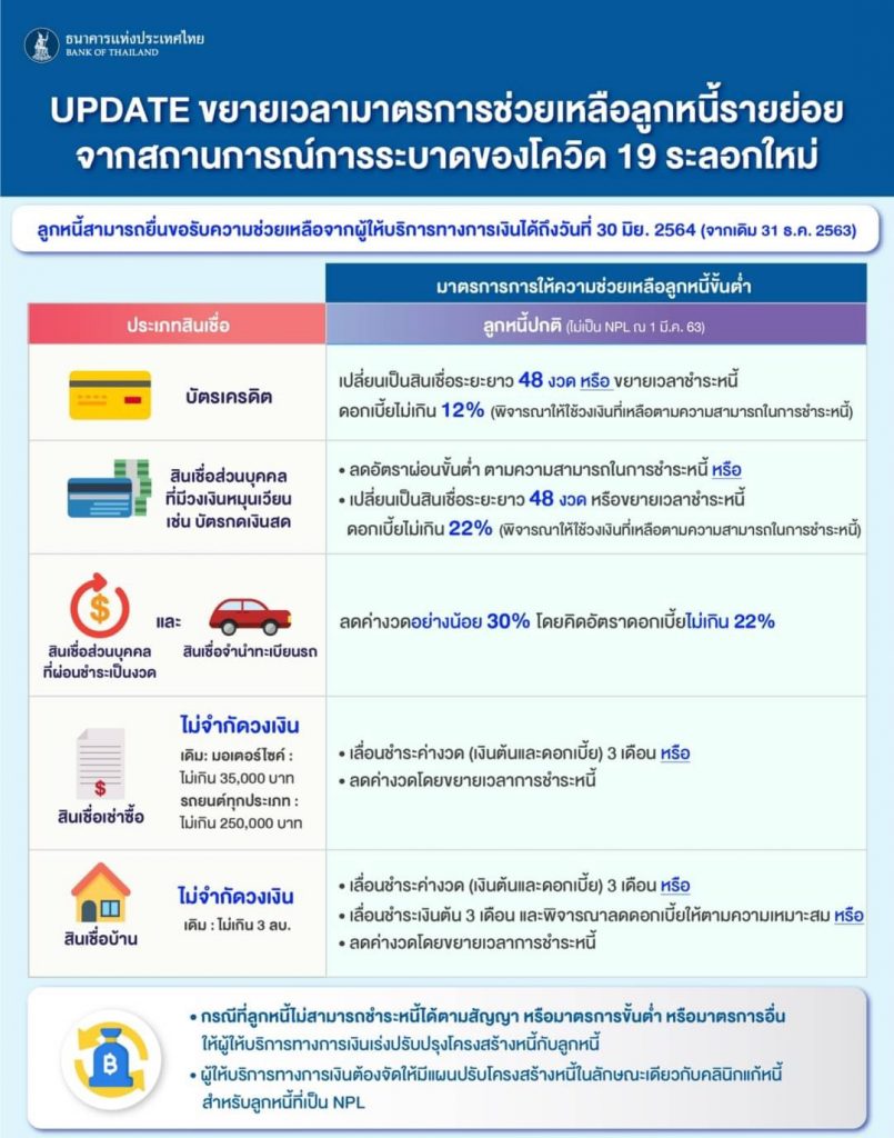 - ขยายเวลาให้ลูกหนี้รายย่อยสมัครรับความช่วยเหลือได้จนถึงวันที่ 30 มิถุนายน 2564 (จากเดิมที่ครบกำหนดในวันที่ 31 ธันวาคม 2563) โดยลูกหนี้สามารถสมัครขอรับความช่วยเหลือด้วยตนเอง หรือนายจ้างหรือเจ้าของกิจการสมัครขอรับความช่วยเหลือแทนลูกหนี้ได้ เช่น ในกรณีสินเชื่อสวัสดิการ โดยต้องได้รับความยินยอมจากลูกหนี้ที่เป็นพนักงานหรือลูกจ้าง เพื่อให้การขอรับความช่วยเหลือของลูกหนี้เป็นไปอย่างมีประสิทธิภาพและทันเหตุการณ์