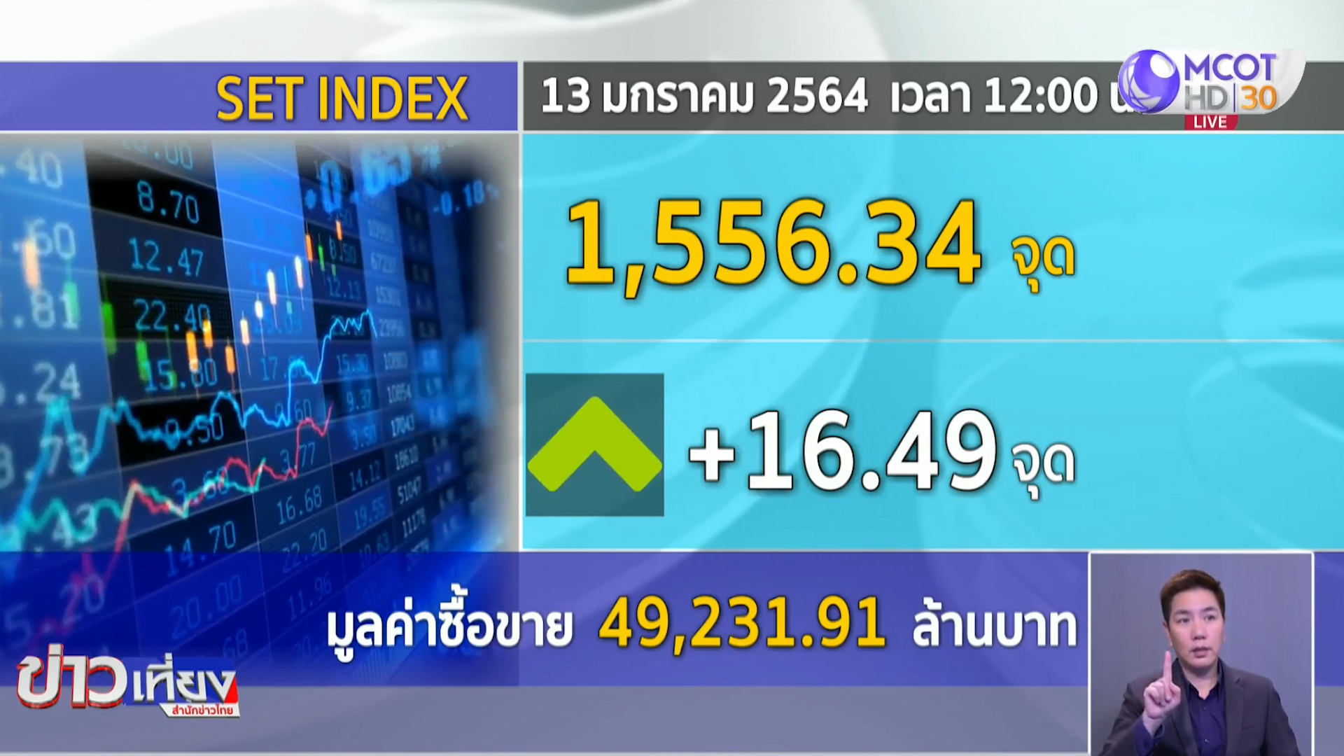 13 ม.ค.-ตลาดหุ้นไทยเช้านี้ เคลื่อนไหวแดนบวก ตลาดตอบรับ มาตรการเยียวยาของรัฐบาลที่ประกาศ วานนี้ ทั้งลดค่าน้ำ ค่าไฟฟ้า อินเทอร์เน็ต การเติมสภาพคล่อง มาตรการเราชนะ และปัจจัยบวกจากราคาน้ำมันที่ปรับขึ้นทำให้เกิดการเข้าซื้อหุ้นกลุ่มพลังงาน