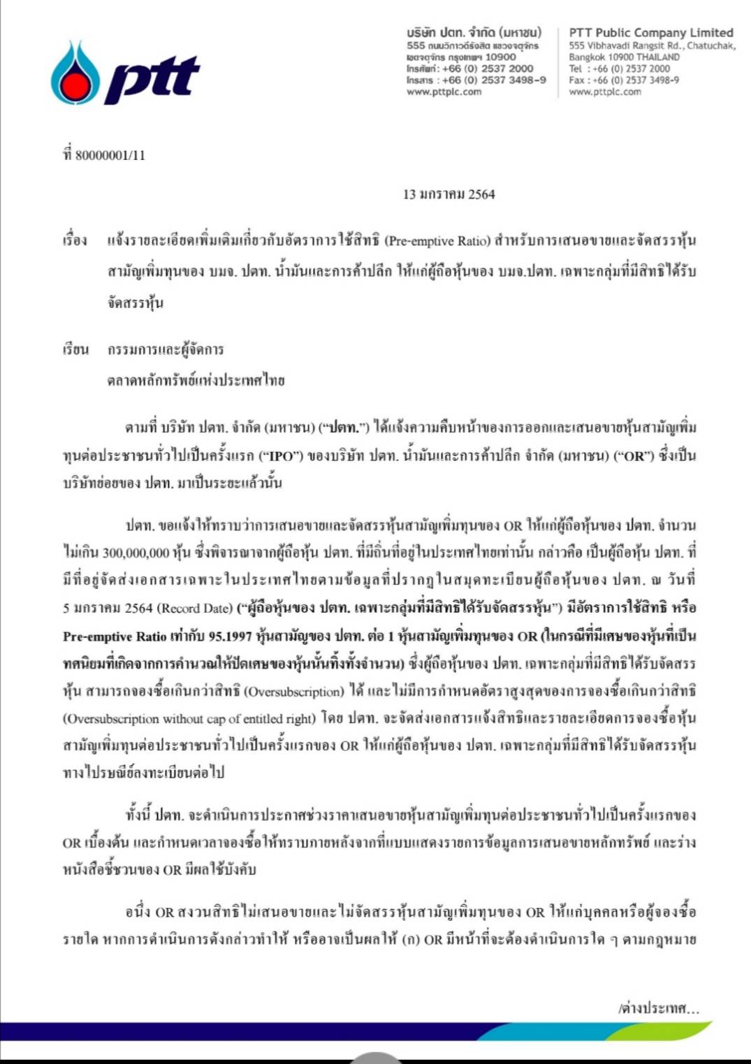 สำหรับการเสนอขายหุ้นเพิ่มทุนของ OR ให้แก่ผู้ถือหุ้นของ ปตท. จำนวนไม่เกิน 300 ล้านหุ้น ซึ่งพิจารณาจากผู้ถือหุ้น ปตท. ที่มีถิ่นที่อยู่ในประเทศไทยเท่านั้น กล่าวคือ เป็นผู้ถือหุ้น ปตท. ที่มีที่อยู่จัดส่งเอกสารเฉพาะในประเทศไทยตามข้อมูลที่ปรากฏในสมุดทะเบียนผู้ถือหุ้นของ ปตท. ณ วันที่ 5 มกราคม 2564 (Record Date) (ผู้ถือหุ้นของ ปตท. เฉพาะกลุ่มที่มีสิทธิได้รับจัดสรรหุ้น) มีอัตราการใช้สิทธิ หรือ Pre-emptive Ratio เท่ากับ 95.1997 หุ้นสามัญของ ปตท. ต่อ 1 หุ้นสามัญเพิ่มทุนของ OR