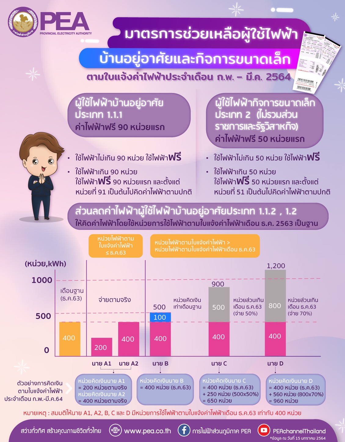 สำนักข่าวไทย 15 ม.ค.- PEA ออกมาตรการช่วยเหลือค่าไฟฟ้าสำหรับผู้ใช้ไฟฟ้าประเภทบ้านอยู่อาศัยและกิจการขนาดเล็กตามมติคณะรัฐมนตรีเมื่อวันที่ 12 มกราคม 2564 เป็นเวลา 2 เดือน ตั้งเเต่ ก.พ.- มี.ค.64