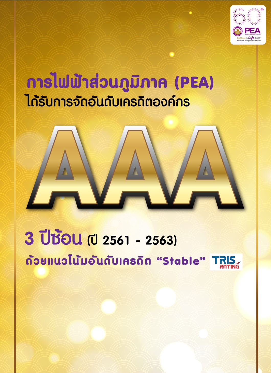 การไฟฟ้าส่วนภูมิภาค (PEA) ได้รับการจัดอันดับเครดิตของ PEA ที่ระดับสูงสุด “AAA” ต่อเนื่องเป็นปีที่ 3 จากบริษัท ทริสเรทติ้ง จำกัด โดยการประเมินอันดับเครดิตดังกล่าวสะท้อนถึงสถานะของ PEA ซึ่งเป็นรัฐวิสาหกิจสำคัญที่มีความสัมพันธ์กับรัฐบาลไทยในระดับสูงและมีบทบาทที่สำคัญในการจัดส่งและจำหน่ายกระแสไฟฟ้าทั่วประเทศไทย นอกจากนี้ อันดับเครดิตยังสะท้อนถึง การได้รับผลตอบแทนที่ดีจากการลงทุนผ่านโครงสร้างค่าไฟฟ้า นโยบายทางการเงินที่รอบคอบรวมถึงการได้รับการสนับสนุนจากรัฐบาลไทย