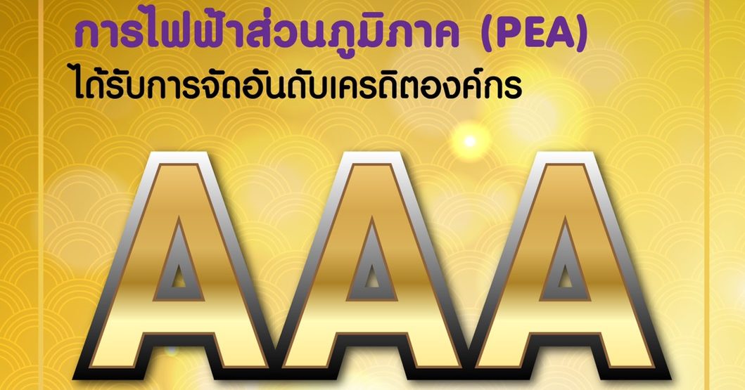 สำนักข่าวไทย 16 ม.ค.- PEA ได้รับการจัดอันดับเครดิตของ PEA ที่ระดับสูงสุด “AAA” ต่อเนื่องเป็นปีที่ 3 ซึ่งเป็นรัฐวิสาหกิจสำคัญที่มีความสัมพันธ์กับรัฐบาลไทยในระดับสูงและมีบทบาทที่สำคัญในการจัดส่งและจำหน่ายกระแสไฟฟ้าทั่วประเทศไทย