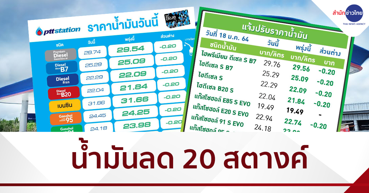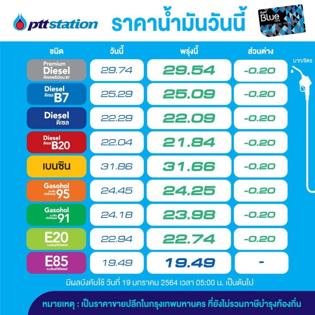 19 ม.ค.-ข่าวดีแจ้งกลางดึก PTT Station บางจากฯ ปรับลดราคาขายปลีกน้ำมันทุกชนิดลง 20 สตางค์/ลิตร เว้น E85 ราคาคงเดิม มีผลวันนี้ (19 ม.ค.64) เวลา 05.00 น. เป็นต้นไป