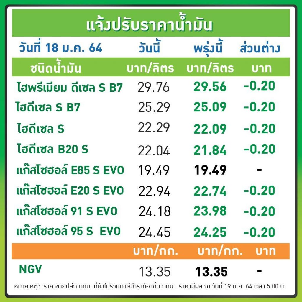 โดยราคาขายปลีกจะเป็นดังนี้ ULG = 31.66, GSH95 = 24.25, E20 = 22.74, GSH91 = 23.98, E85 = 19.49, HSD-B7 = 25.09, HSD-B10 = 22.09, HSD-B20 = 21.84,