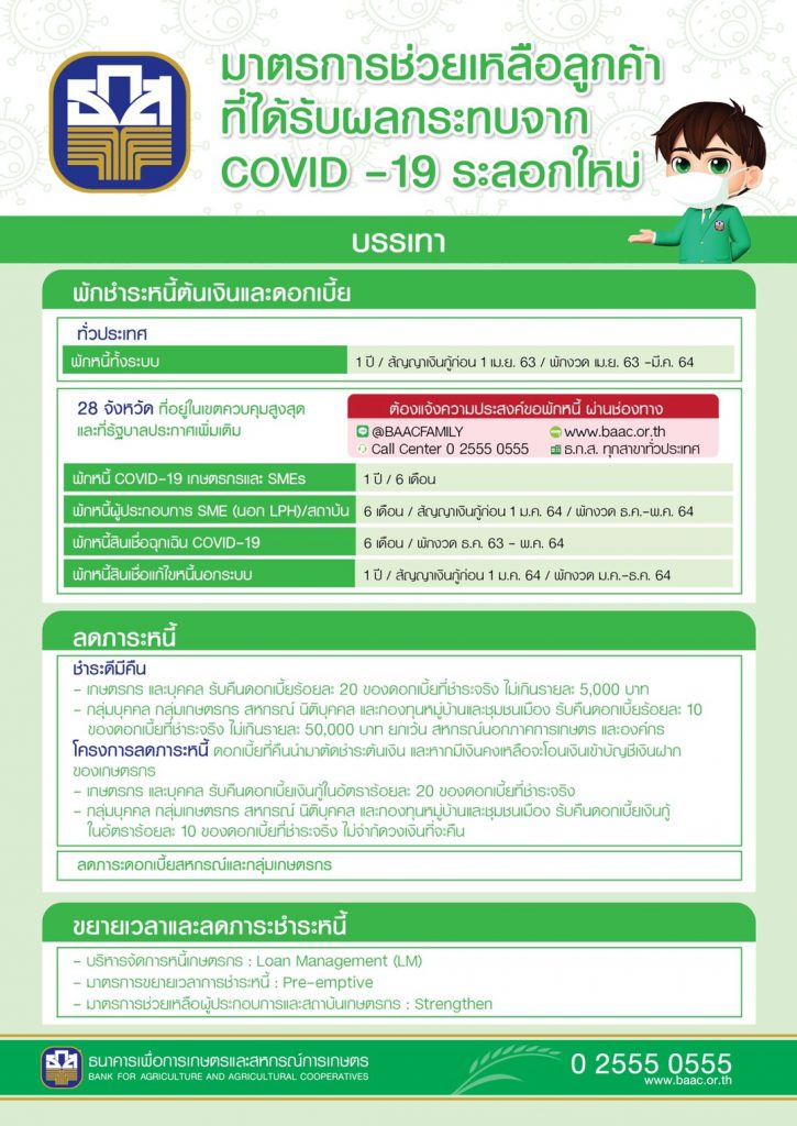นายสุรชัย รัศมี รองผู้จัดการ รักษาการแทนผู้จัดการธนาคารเพื่อการเกษตรและสหกรณ์การเกษตร (ธ.ก.ส.) เปิดเผยว่าเพื่อบรรเทาผลกระทบจากสถานการณ์การแพร่ระบาดของโรคติดเชื้อไวรัสโคโรนา (COVID-19) ระลอกใหม่ โดย ธ.ก.ส. ได้ออกมาตรการเพิ่มเติมจากการพักชำระหนี้ต้นเงินทั้งระบบ เป็นเวลา 1 ปี ที่ดำเนินไปแล้วในช่วงที่ผ่านมา และเพื่อช่วยเหลือเกษตรกร ผู้ประกอบการ SMEs สหกรณ์การเกษตร สหกรณ์ร้านค้า สหกรณ์บริการ วิสาหกิจชุมชน กองทุนหมู่บ้านที่ได้รับผลกระทบจากสถานการณ์ดังกล่าวและอยู่ในพื้นที่ 28 จังหวัดที่อยู่ในเขตควบคุมสูงสุดและที่รัฐบาลประกาศเพิ่มเติม โดยธนาคารจะดำเนินการ 1) พักชำระต้นเงินสำหรับเกษตรกร 1 ปี 2) พักชำระต้นเงินผู้ประกอบการ SMEs สหกรณ์การเกษตร สหกรณ์ร้านค้า สหกรณ์บริการ วิสาหกิจชุมชน กองทุนหมู่บ้าน ระยะเวลา 6 เดือน กรณีเป็นสินเชื่อใหม่ที่มีหนี้ถึงกำหนดชำระในเดือนธันวาคม 2563 ถึงพฤษภาคม 2564 ให้พักชำระต้นเงินสินเชื่อฉุกเฉินโควิด-19 ที่ถึงกำหนดชำระออกไปอีก 6 เดือน รวมถึงพักชำระต้นเงินสินเชื่อผู้ที่เข้าร่วมโครงการแก้หนี้นอกระบบออกไปอีก 1 ปี