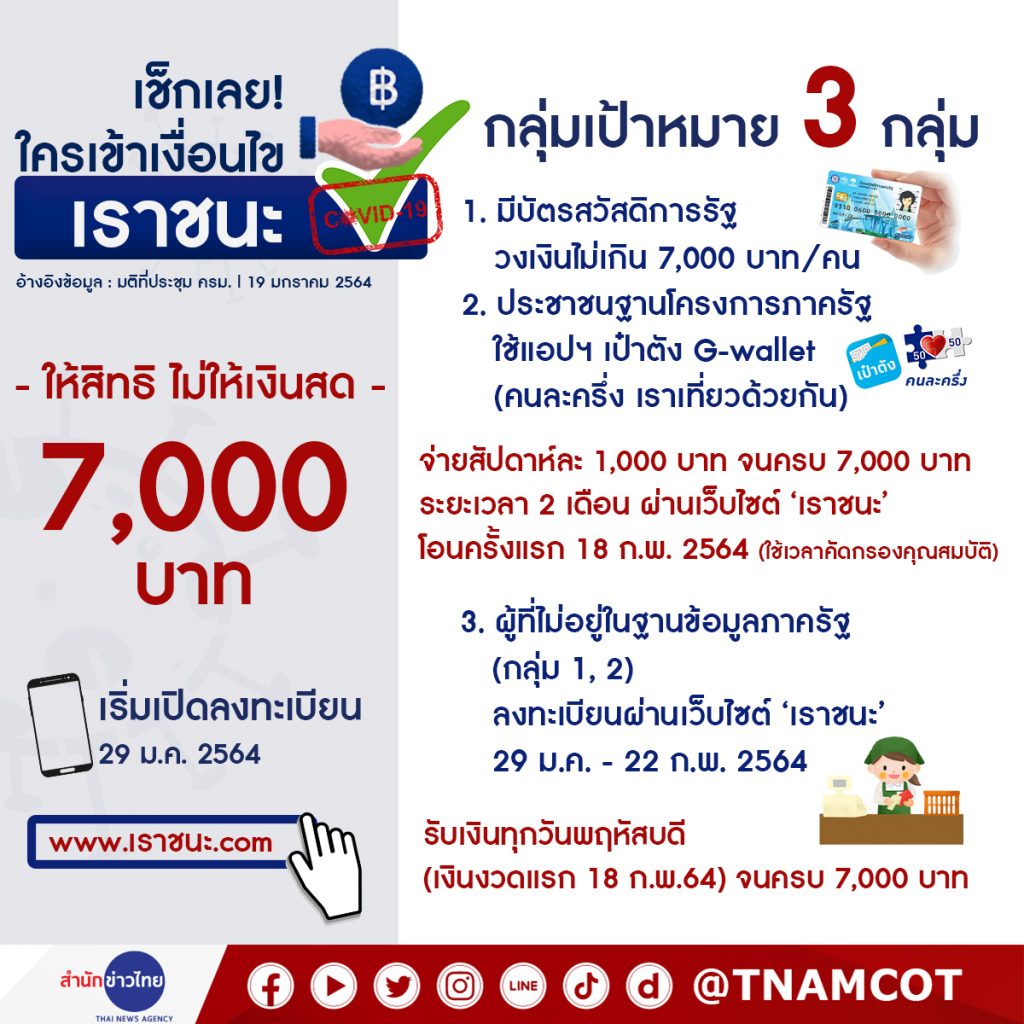 1.ผู้ถือบัตรสวัสดิการแห่งรัฐ ได้รับเงินอัตโนมัติ (ไม่ต้องลงทะเบียน) ได้รับเป็นรายสัปดาห์ละ 1 พันบาท รวมกับเงินที่ได้บัตรสวัสดิการแห่งรัฐที่รัฐบาลให้ทุกเดือนอยู่แล้วนั้น รวม 2 เดือนเป็นเงิน 7,000 บาท เริ่มใช้ 5 ก.พ.64