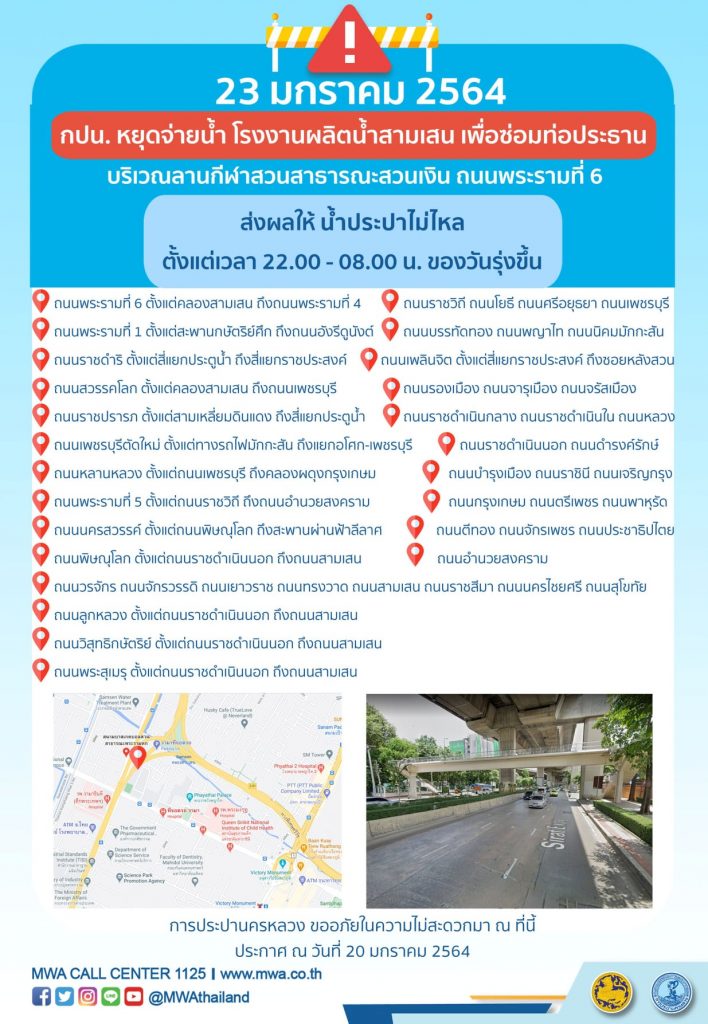 การประปานครหลวง (กปน.) มีความจำเป็นต้องหยุดจ่ายน้ำ โรงงานผลิตน้ำสามเสน เพื่อซ่อมท่อประธานขนาดเส้นผ่านศูนย์กลาง 1,000 มิลลิเมตร บริเวณลานกีฬาสวนสาธารณะสวนเงิน ถนนพระรามที่ 6 ในคืนวันเสาร์ที่ 23 มกราคม 2564 ตั้งแต่เวลา 22.00 – 08.00 น. ของวันรุ่งขึ้น เพื่อให้ประชาชนได้รับบริการน้ำประปาอย่างเพียงพอและทั่วถึง โดยระหว่างดำเนินการ ส่งผลให้ น้ำประปาไม่ไหล ในพื้นที่ดังต่อไปนี้
