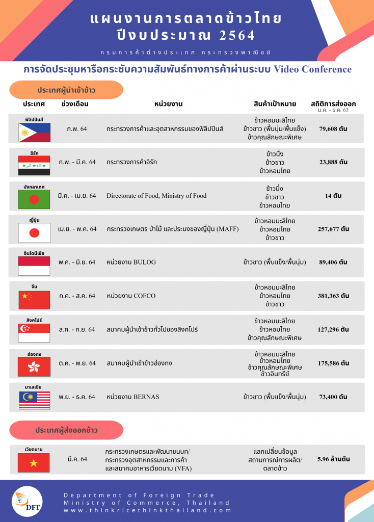 อย่างไรก็ตาม แผนการดำเนินการด้านการตลาดและประชาสัมพันธ์ข้าวไทยในต่างประเทศในปี 2564 ในช่วงสถานการณ์การแพร่ระบาดของโรค COVID – 19 ที่กลับมามีความรุนแรงขึ้นในหลายประเทศทั่วโลกรวมทั้งประเทศไทย ทำให้กรมฯ ไม่สามารถเดินทางไปพบปะกระชับความสัมพันธ์กับลูกค้าหรือเข้าร่วมงานแสดงสินค้านานาชาติในต่างประเทศดังเช่นที่ผ่านมาได้ อย่างไรก็ตาม กรมฯ ในฐานะหนึ่งในหน่วยงานหลักในการขับเคลื่อนยุทธศาสตร์ข้าวไทย ปี 2563 – 2567 จะใช้โอกาสนี้ในการเร่งดำเนินการตามแผนยุทธศาสตร์ข้าวไทยให้บรรลุผลอย่างเป็นรูปธรรม โดยเฉพาะอย่างยิ่งการปรับกฎระเบียบให้เอื้อต่อการพัฒนาอุตสาหกรรมข้าวไทย การจัด Workshop เพื่อพิจารณาแนวทางผลักดันการพัฒนาพันธุ์ข้าวโดยประสานกรมการข้าว กระทรวงเกษตรและสหกรณ์ รวมทั้งการจัดทำข้อมูลตลาดข้าวเชิงลึกเพื่อส่งต่อให้หน่วยงานภาคการผลิตต่อไป เพื่อให้ไทยสามารถผลิตสินค้าข้าวที่ตอบโจทย์ความต้องการของผู้บริโภคในแต่ละตลาดมากขึ้น