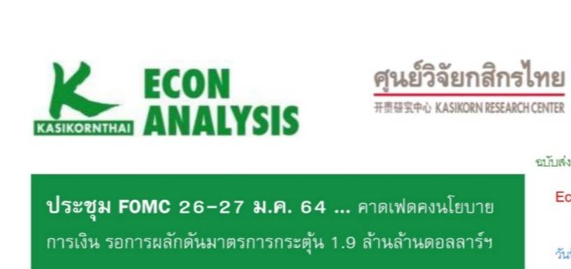 กรุงเทพฯ 25 ม.ค.- ศูนย์วิจัยกสิกรไทย ประเมิน ประชุม เฟดคงนโยบายการเงิน และติดตาม มาตรการกระตุ้นเศรษฐกิจ “โจ ไบเดน” 1.9 ล้านล้านดอลลาร์ฯ