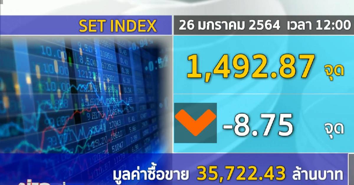 กทม. 26 ม.ค.-ดัชนีหุ้นไทยภาคเช้า ลดลงตามตลาดภูมิภาคและความกังวลเศรษฐกิจฟื้นตัวช้า กองทุนต่างชาติชะลอตัวลงและยอดผู้ติดเชื้อโควิดในประเทศเร่งตัวขึ้น ดัชนีช่วงเที่ยงอยู่ที่ 1,492.87 จุด ลดลง 8.75 จุด