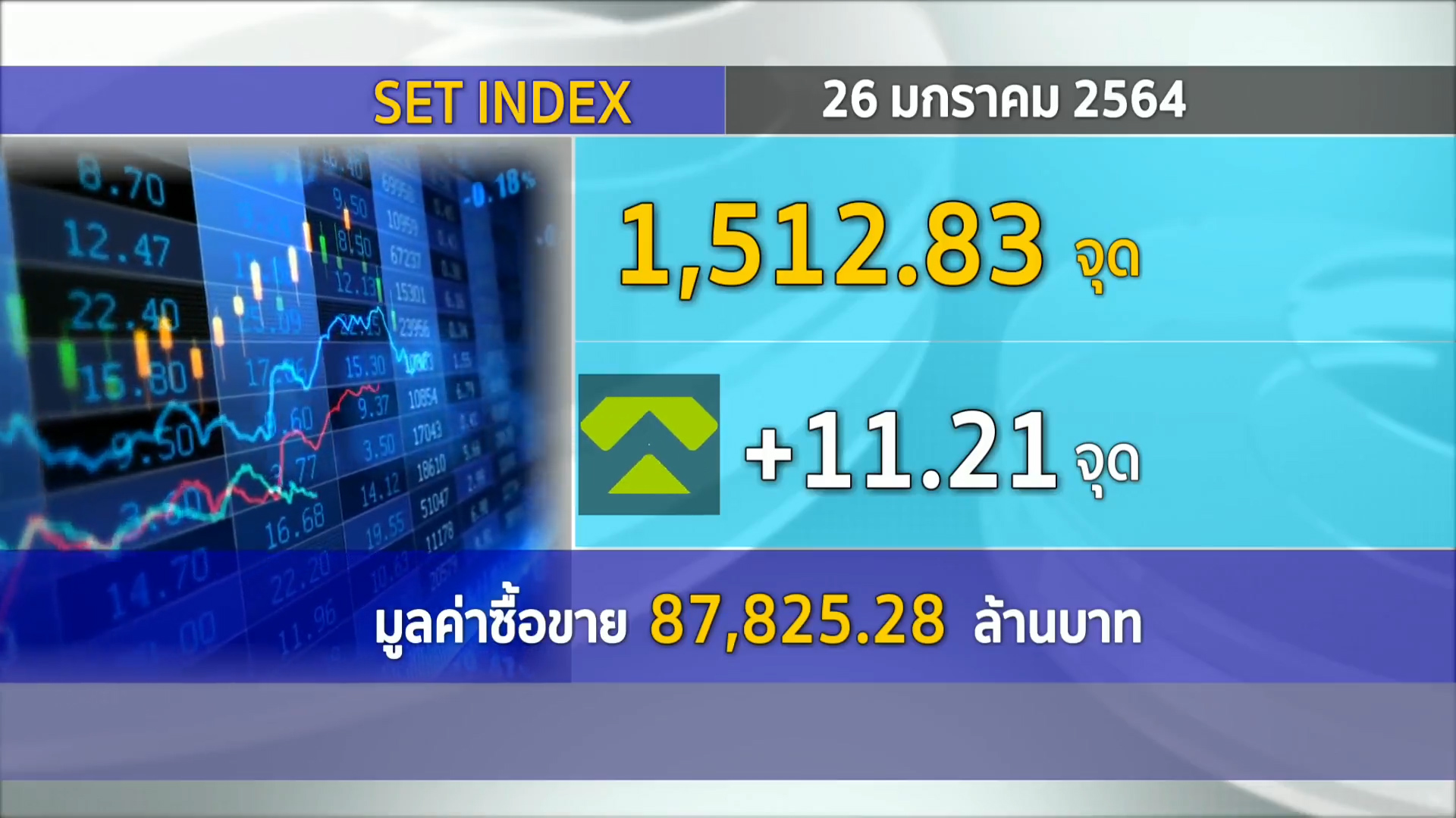 26 ม.ค.-ตลาดหลักทรัพย์ปิดวันนี้ที่ระดับ 1,512.83 จุด เพิ่มขึ้น 11.21 จุด (+0.75%) มูลค่าการซื้อขาย 87,825.28 ล้านบาท การซื้อขายหุ้นวันนี้ ดัชนีหุ้นไทยเคลื่อนไหวทั้งแดนบวกและลบ